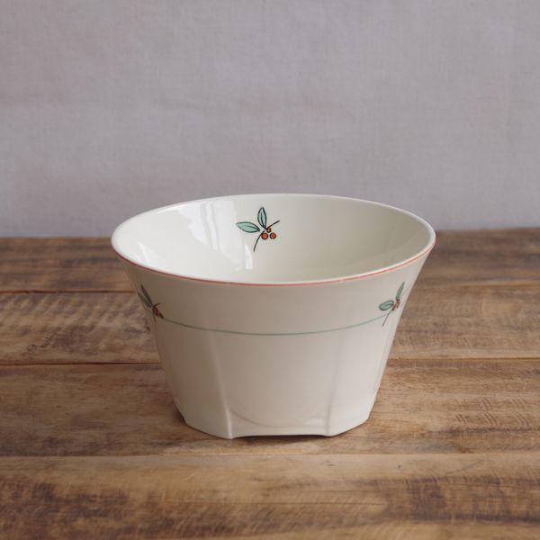 イギリスの陶器メーカー Alfred Meakin のシュガーボウルです。 Marigold というシリーズのものです。 陶磁器よりも柔らかく軽い素材で、 真っ白ではなく、淡いアイボリーです。 赤い実をつけた枝が描かれており、 濃いオレンジ色の縁取りが入っています。 1930〜40年代ごろのものと思われます。 【状態について】特に目立つチップやヒビはありません。 若干の擦り傷や色剥げはありますが、 全体として傷が少なく、ツヤがあり、 ヴィンテージ品としてはきれいな状態です。 製品本来の品質として、ちょっとした色むら、色抜け、色汚れ、 小さな黒点や不整形等はある場合があります。 詳細は写真にてご確認ください。 --- ■サイズ: 高さ約 6.9cm 口径約 12.6cm ※ 写真に写りこんだデコレーション等はお届け内容に含まれません。
