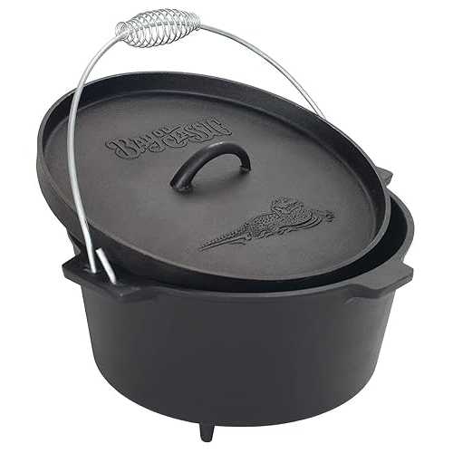 Bayou Classic Pre-Seasoned Cast Iron Dutch Oven w/ Feet Features Flanged Camp Lid Stainless Coil Wire Handle Grip, 8-qt Perfect For Baking Frying One-Pot Meals Stews and Chili