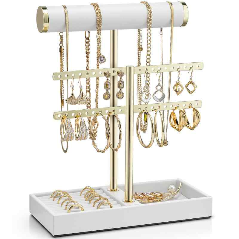 Vlando アクセサリースタンド 2段 ネックレススタンド PUレザー トレー アクセサリー収納 ジュエリーケース ネックレス ピアス リング ブレスレット フック 誕生日プレゼント 女性用(ホワイ