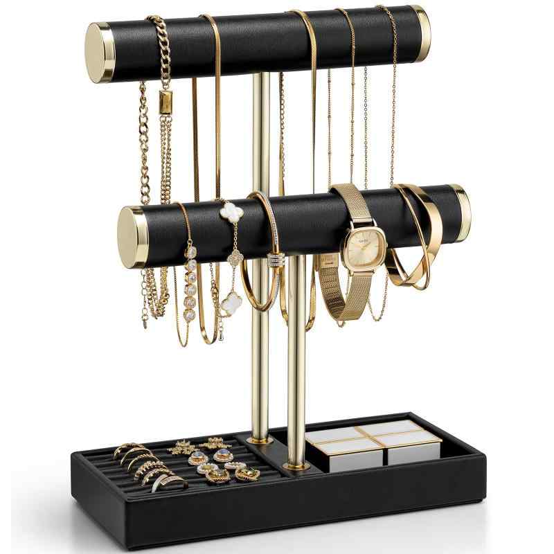VLANDO アクセサリースタンド 2段 ネックレススタンド PUレザー トレー アクセサリー収納 ネックレス ハングル リング ブレスレット 誕生日プレゼント 女性用(ブラック)