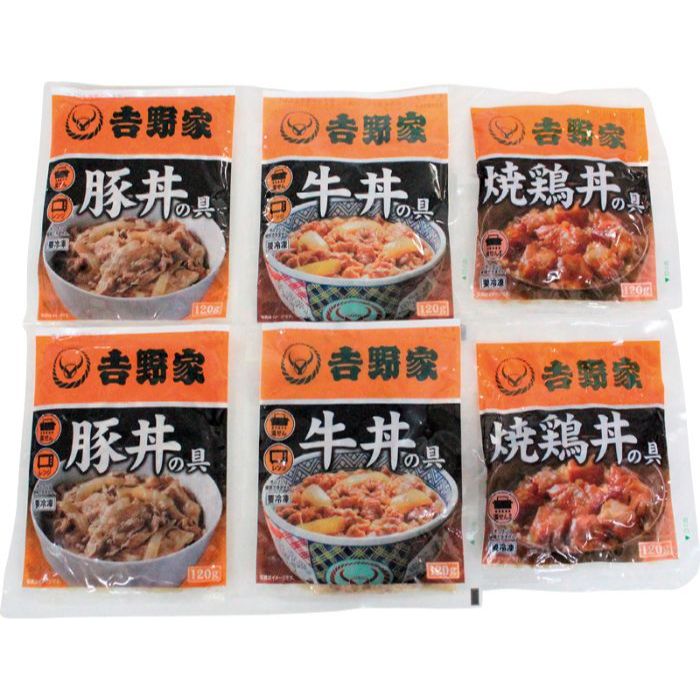 門外不出の吉野家秘伝の味をご家庭でお楽しみいただけます。吉野家が目指してきた味は、しっかりした、まろやかなタレの味です。門外不出の吉野家秘伝の味をご家庭でお楽しみください。100年にわたる経験と努力の結晶である吉野家 牛丼の具。「牛丼のタレ」をベースに豚肉の旨みを引き出した豚丼の具。一味違う豚丼をこの機会にご賞味ください。焼鶏丼の具は、特製タレで鶏肉を香ばしく焼き上げました。アツアツご飯に盛り付けて、温泉卵をトッピングしても良し!お皿に盛り付けて、おつまみとしても良し! *調理方法:レンジ、湯煎対応。(焼鶏丼はレンジ不可)牛丼の具・豚丼の具・焼鶏丼の具(各120g)×各2賞味期間:1年アレルゲン:小麦 ◆沖縄・北海道・離島・一部地域へのお届けはお受けできません。 ◆代金引換によるお支払いはできません。 ◆メーカーより直送となりますので、他の商品とは同梱できません。本商品のみでご注文ください。 ◆ご注文後のキャンセル、ご変更は一切お受けできません。万一、発送後のキャンセルをされた場合、往復の送料をご負担頂きます。 ◆お届けの日時指定、運送会社の指定ができません。 ◆発送後、翌営業日中にお荷物伝票番号をメールにてご連絡いたします。