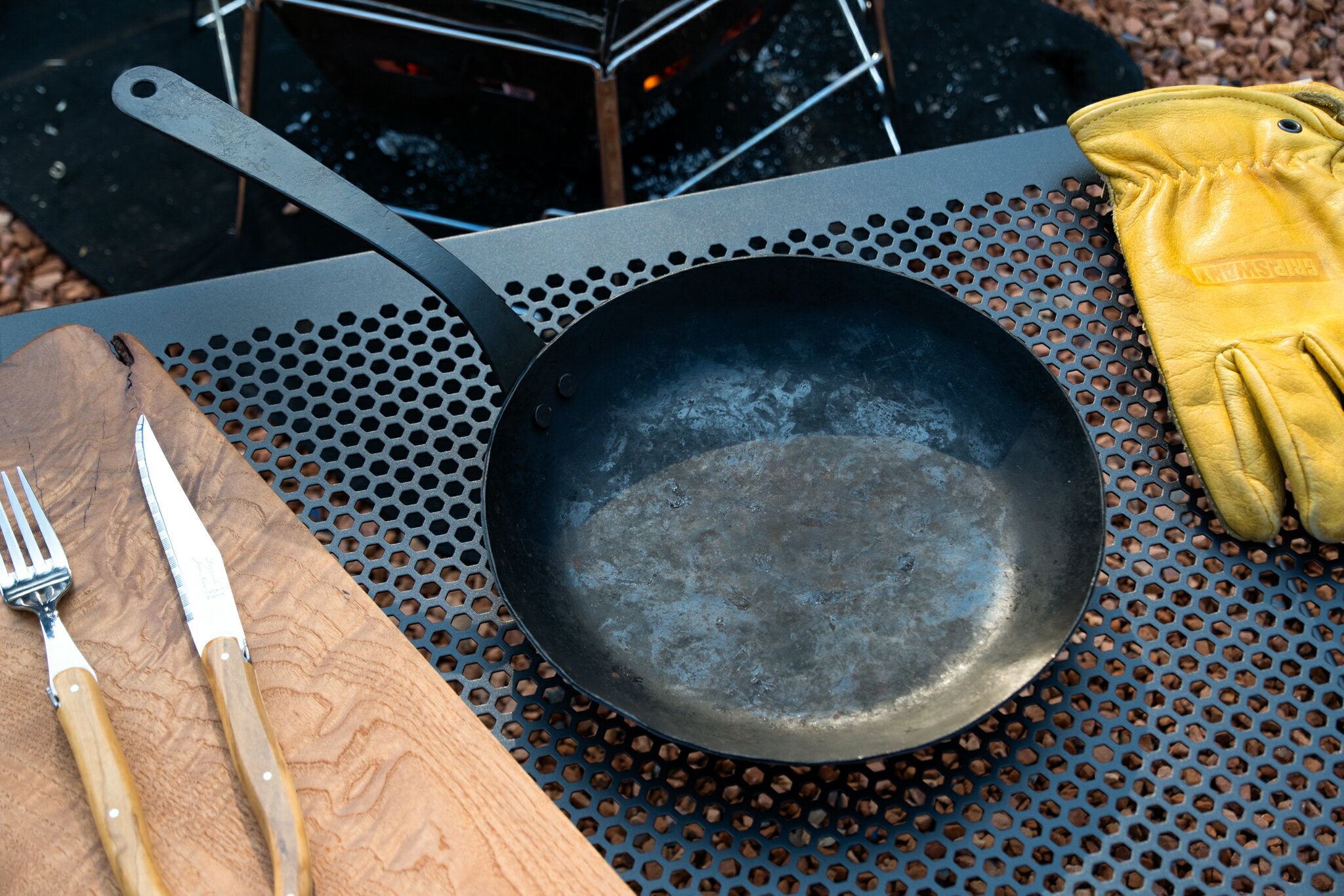 yamahide刻印が入ったオリジナル製品。 長年にわたり刃物の鍛冶経験をもつ新潟の鍛冶屋に依頼し特注した鍛造鉄フライパンとなります。 約2 mm の厚みに鍛造された鉄フライパンは熱を蓄える力が大きいので、たっぷりの熱を食材に素早く通しうま味を閉じ込め美味しく焼き上げます。 鉄ならではの優れた耐久性と育てる楽しみをぜひお楽しみください。 無骨でワイルドな鉄フライパンをお求めの方にピッタリです。 焚き火にはナイフと鉄フライパンが良く似合いますね。 工房で黒錆び加工までは施してあります、ご家庭で適度にシーズニングを行ってからお使いください。 IH非対応 ・鉄フライパン ハンドル付 22cm: 992 g ・鉄フライパン ハンドル取り外し20cm: 740 g ・鉄フライパン ハンドル取り外し 22cm: 848 g ・鉄フライパン ハンドル取り外し 24cm: 1048 g ・両手鍋 22cm: 938 g 鉄のフライパンお手入れ方法(洗い方) 使い終わった鉄製品はすぐに洗って、水気を飛ばしてください。 調理後は内容物を保存せず、すぐ他の容器に移しましょう。 料理を入れたままにしておくと塩分や酸等によりサビ発生の原因になります。 1.鉄フライパンをたわしで洗う 鉄フライパンが温かいうちにたわしやささらを使い、お湯で洗います。 2.鉄フライパンの水気を飛ばす 水気を拭き取り中火で加熱し、完全に水気を飛ばします。 水分が付着したままでは必ずサビますので注意してください。 3.鉄フライパンに油を塗る キッチンペーパー等を使い、内側に油を刷り込むように塗ります。 ※熱いのでヤケドに注意 ※洗剤を使うとなじんだ油が洗い流されてしまい、焦げやすくサビやすくなってしまいます。 汚れがひどい場合は食器用洗剤を使用してもOKですが、洗浄後は必ず中火で加熱し、水気を飛ばしてから 油ならし を行なってください。