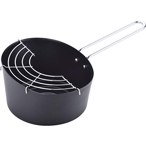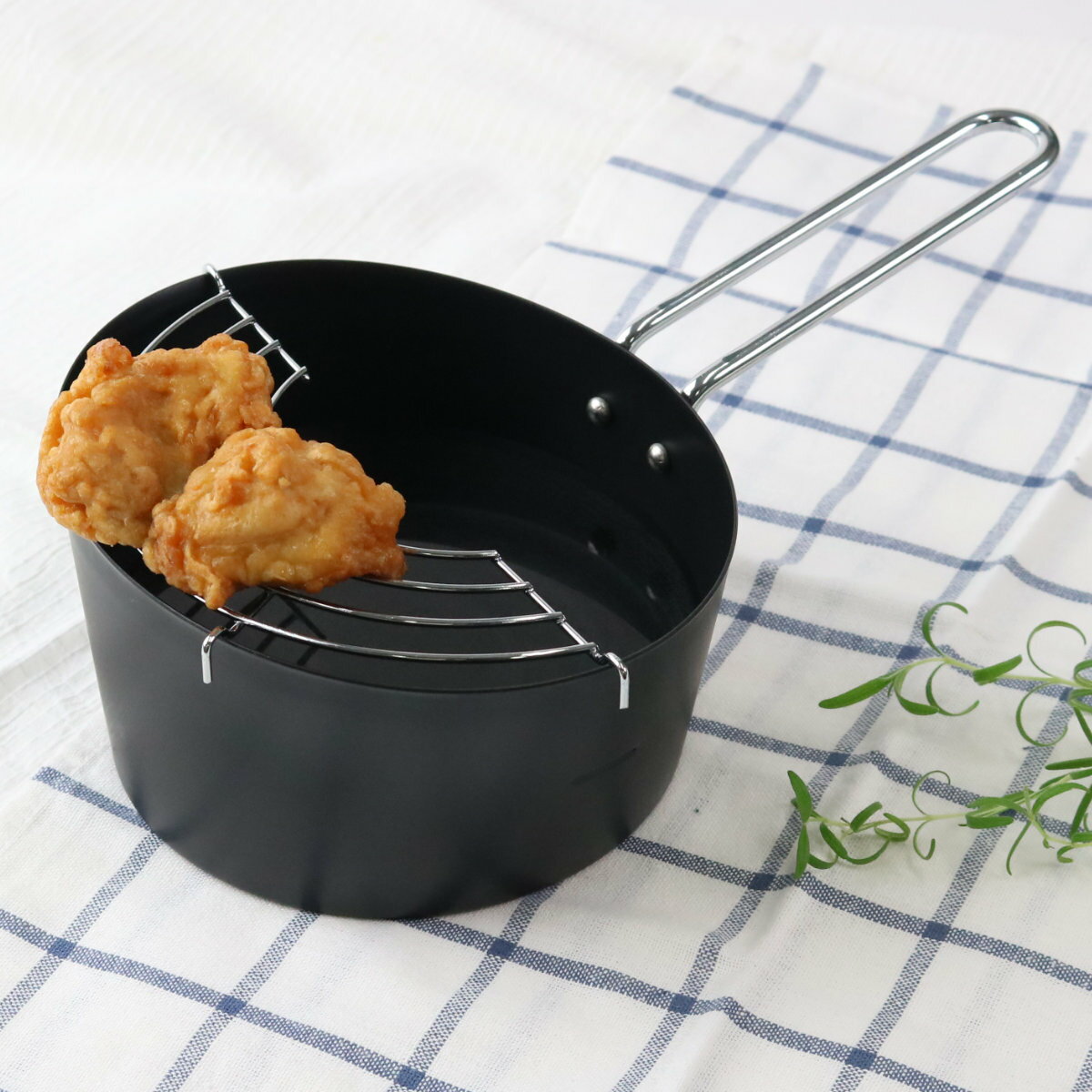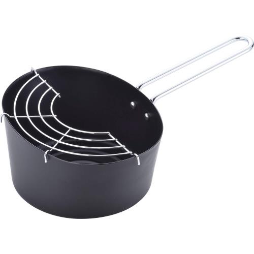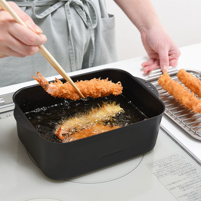 弁当のおかずやエビフライなどの揚げ物 商品サイズ(ハンドル含む):約幅26.5x奥行18.9x高さ10.5cm、重量:約480g 鍋の高さ:7.9cm 本体:鉄(シリコン樹脂塗装)、底の厚さ:1mm、アミ:鉄(クロムメッキ) 生産国:中国 満水容量:約1.3L、適正油量:約530g