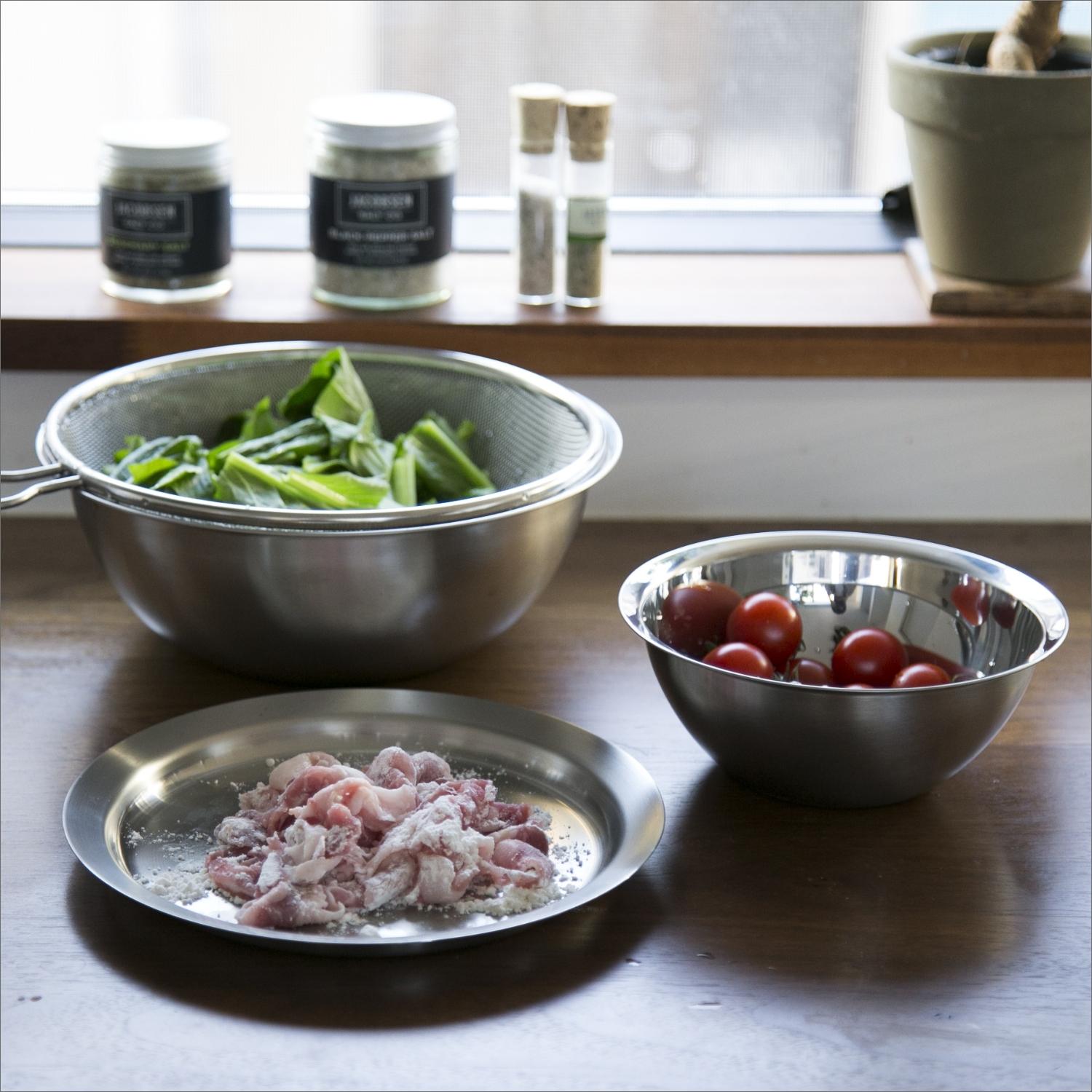 サイズ(目安) W20×H10cm 内径:18cm(ボウル底面に18と表示があります) 重量(目安) ザル:180g、ボウル:206g 材質 18-8ステンレス(14メッシュ) 使用区分 電子レンジ ×、食洗機 ○、オーブン × 原産国 日本 ■ご確認ください ●ご使用の前に同梱している取扱説明書をよくお読みのうえ、正しく使用してください。 ●小さな傷や跡、黒ずみ、ムラ、凹凸が見られる場合があります。また接合部分に凹凸や着色などが見られる場合があります。製造工程のものですので、ご了承ください。 ※ラッピングをご希望の方はこちらをご覧ください。家事問屋 横口ボウルザルセット 20 調理の下ごしらえをしっかりサポート 清潔で機能的。これが家事問屋の台所道具。 常に衛生的に扱える丈夫なステンレス製で余計な装飾を持たせない端正なデザインが好印象。 それぞれの用途が明確なため使いにくさが全くなく、 使い手目線にこだわった機能性は快適そのものです。 金属加工の産地、燕三条の地に根差す職人さんが生みだす、 働きもので長く付き合える頼もしい道具たちが日々の台所仕事を楽しい時間に導きます。 ボウルの横に注ぎ口を付けた画期的なアイデアに大感動してしまう、横口ボウルザルセット。 とにかく使ってみるとその便利さに驚きます。 ボウルとザルはすっきり収まり、 ザルには取っ手が付いているから持ち上げて水を切る動作も簡単。 ザルをセットした状態で茹でためんを洗う時も流れ出すことがないから 心おきなくぬめりを取ることができちゃいます。 小さいサイズは葉物野菜を洗うときやあさりなどの貝類を流水で洗うとき、 もちろんめん類や米ときなどなど、ボウル&ザルを使うシーンでフル回転で働いてくれそう。 またユニークな使い方としてはたこ焼きやだし巻き卵、 ホットケーキを焼くときに片口を活かした使い方ができるんです。 生地をたこ焼き器やフライパンに流すときにお試しください!一回り大きい26cmサイズもございます。 ※仕様は、技術改善などにより予告なく変更する場合があります