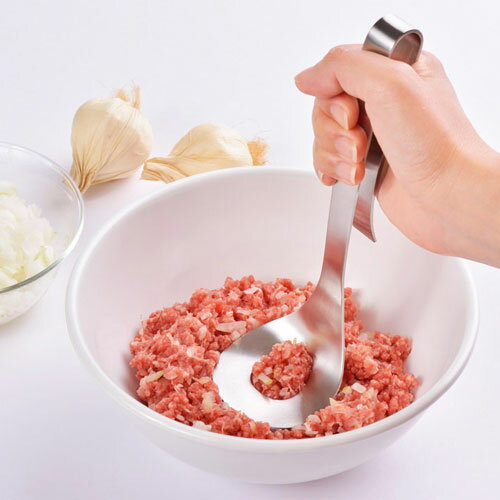 TV雑誌で話題の商品!手のひらの代わりにお肉がこねられる、スプーン型のキッチンツール。 手が汚れたり、冷たくならないので、手が荒れやすい人にもオススメです。 直接触らないので手の温度が移らず、お肉の脂肪を溶かさないのでジューシーに仕上がります。お肉をこねる以外にも和え物を混ぜたり、湯きりで野菜をすくったり、じゃがいもをつぶすときにも使えます。 【サイズ】全長20×幅6.2×高さ7(cm) 【素材】ステンレス鋼(クロム18%) 【重量】約100g 【原産国】日本 ※この商品は製造元から直接出荷される商品の為、他の商品とは別配送となります。 (製造元)オークス株式会社 <平日の午前11時ご注文分まで当日出荷可能> ※土日祝日および弊社指定休業日前後のご注文については発送に時間が掛かる場合がございますので、ご了承下さい。手のようにお肉をこねられます 先が大きな穴形状なので肉がくっつきにくく、作業はスムーズ。手がベタベタしたり冷たくなったりなどの不快な思いは、これで解消! 1本4役と大活躍! こねる・混ぜる・すくう・つぶすがこれ一本でできます。ハンバーグの下ごしらえ、和え物、野菜の湯きり、マッシュポテト作りに便利! 便利なカタチ! 柄の部分は、握った時にソフトな感触になるように折り返してあり、長く握っていても手が痛くなりにくいカタチです。 サッと置けるから便利! 先端が浮くので調理スペースを汚しません。手もキレイなままなので、調理中の急な来客や電話にもスグ対応できますよ。 手でこねるよりも、お肉のおいしさを引き出します。 お肉は冷たいままこねるのが、ジューシーに仕上げるコツ。 ミートこねらーを使えば、直接お肉に触らないので、手の温度が移りません。お肉の脂肪を溶かさず、ジューシーさを保つことができます。 材料とミートこねらーを冷蔵庫で冷やしておくと、さらに効果的です。 ハンバーグの下ごしらえに、ミートこねらーを使ってみました。 手を使うのと同じように、お肉がしっかりこねられます。 手を洗ったりの手間がはぶけるので、時短になりますね♪ 小ぶりで握る部分もしっかりしてるので、手が疲れません。 じゃがいもやかぼちゃをつぶしたりなど、マッシャーとしても使えますよ。