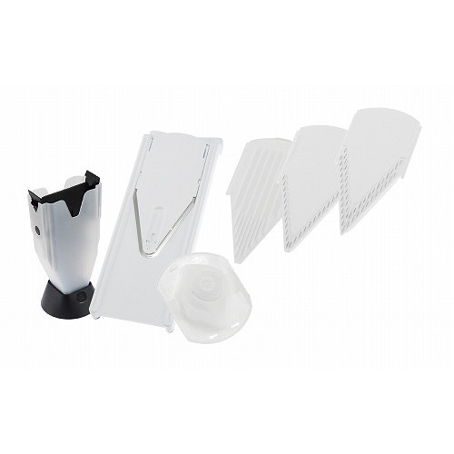 ●セット内容:本体,ブレードガード(裏面は3.5mmスライス部品機能付),安全ホルダー,薄切り厚切り部品(薄切り2mm、厚切り5mm),1.6mm千切り部品、3.5mm千切り部品、ブレードケース外寸(mm)360×125×H85 重量630g
