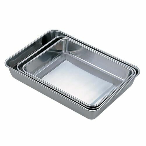 【ステンレス浅型角バット 18枚取】 ●サイズ:266mmx206mmx高さH35mm ●材質:ステンレス製 ■安価ステンレス仕様の価格重視タイプ。 ■食材の仕込みから料理の陳列まで幅広く活躍!業務用の定番『ステンバット』。