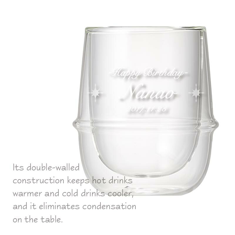 ギフト対応 彫刻内容について (タイトル)英数20文字程度 (お名前)英数15文字程度 (日付)英数15文字程度 ★オリジナルメッセージについて★ ※お選びいただいた書体や文字数などによって、デザイン調整いたします。 フォント(書体)について 英語書体からお選びください。 ※日本語に対応していません。 ※入力された文字はそのまま彫刻されます。ご注意ください。 例)yamamoto ← 頭文字は小文字のまま彫刻されます。 用途 タンブラー コーヒーカップ オーブン:使用不可 電子レンジ:温めのみ使用可 サイズ φ70 x H100 x W85 mm / 250 ml ★ご注意 ○耐熱温度差 120℃ ○直火、オーブンでご使用いただけません ○電子レンジで加熱しすぎたり、空焚きにならないようご注意ください ○二重構造のため、手で触れる部分が熱くなくても中の飲み物が熱い場合がございます、やけどには十分にご注意ください ○ガラスの急冷は破損の原因となります、熱いうちに濡れた布で触れたり、濡れた場所に置かないでください ○氷を勢いよく入れると内側のガラスが割れる可能性がございますのでご注意ください ○洗浄の際はクレンザーやたわしを使用しないでください ○商品底部にオリジナルのロゴマークが入っています ○ヒビ・カケ・傷のついた製品は思わぬ時に破損し、ケガをするおそれがございますので使用しないでくださいドリンクの適正温度をキープするダブルウォールカップ 耐熱ガラス二重構造で、熱いスープやコーヒーはあつあつのまま、冷たいアイスティーやシャンパンはひんやりと味わえます。しかも表面に水滴がつきにくく、テーブルを濡らす心配もありません。リングに指をかければグラスはしっかり掌にフィットし、持ちやすさも抜群。 誕生日のお祝いをはじめ、入学、入社、母の日、父の日、周年記念などの色々なシーンに向いております。 結露しにくく、保温、保冷など機能性に優れたグラスを記念にプレゼントされてはいかがでしょうか。 冬は暖かい飲み物を、夏は冷たい飲み物を、温度を保ちながら楽しめます。 温かい飲み物でも手が熱くなく、冷たい飲み物でも結露しない(水滴がつかない)高機能で、春夏秋冬、季節を気にせず一年中オールシーズン使用ができます。 ※ペアではございません。※Sサイズ(コーヒーカップグラス250ml)単品の販売です。 Lサイズ Sサイズ 「使いやすさ」をきわめたデザイン 「使い手にとって誠実なデザインとは?」KRONOSは、ここからスタートしました。 その答えを導いたのは「エルゴノミクス(人間工学)」。 人間の体の動きや心理をふまえ、使い手のストレスを できる限り減らすデザイン工学です。ドリンクの入ったカップを「持つ」。 KRONOSは、この動作に寄り添いました。 力を入れず楽に扱えるため、握力や体力の少ない方にも喜ばれています。 ※ペアではございません。