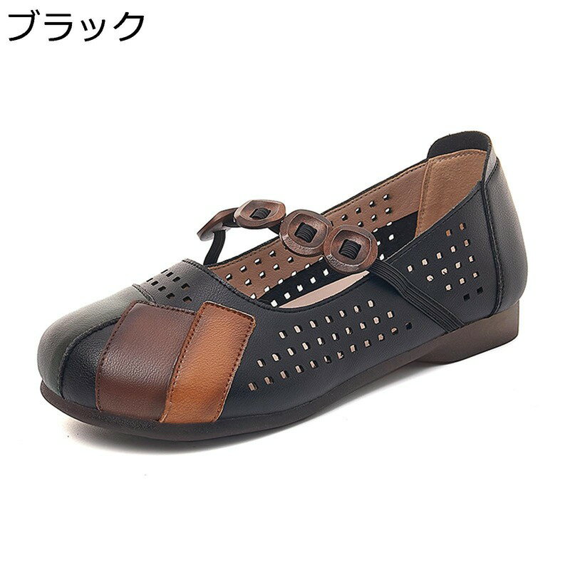 パンプス 本革 甲ストラップ メリージェン フラットシューズ レディース ラウンドトゥ 透かし彫り 通気穴 ママシューズ 春 夏 秋 ファッション 定番 潮流 やわらか 走れる 軽い 速乾性 切り替え 森系