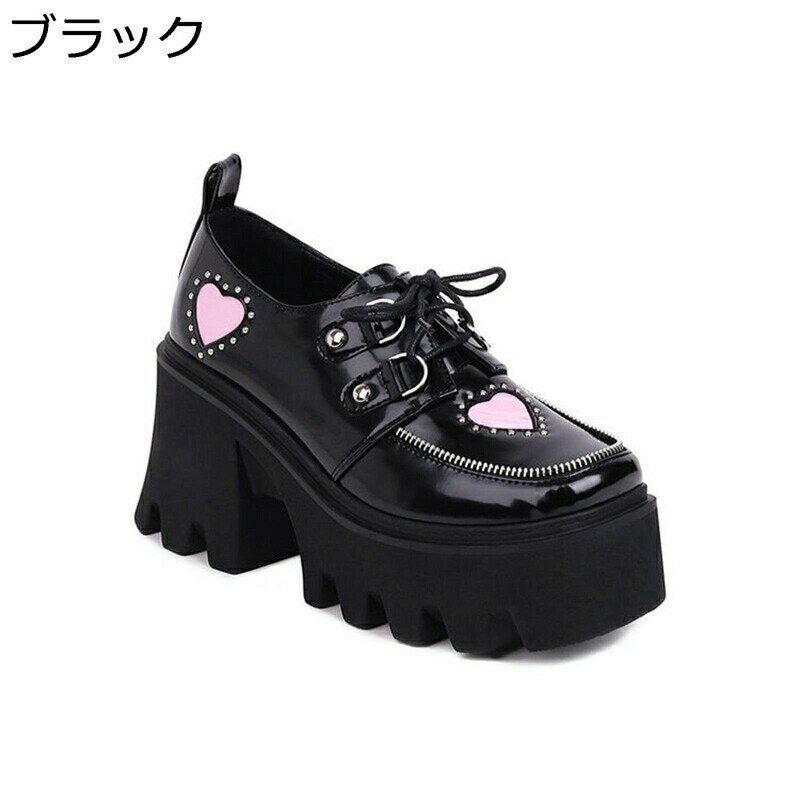 メリージェーン プラットフォーム8.5cm レディース パンプス ハート 黒ピンク レースアップシューズ 粗いかかと 大きいサイズ 可愛い パンク系 ゴシック 地雷系 定番 潮流 安定感 身長アップ 22-26.5cm