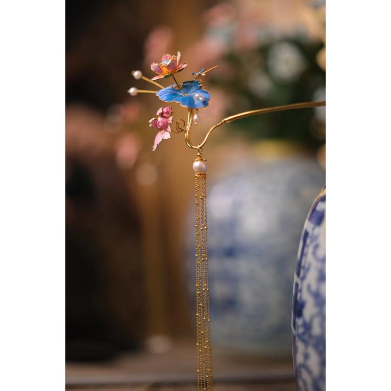 かんざし レディース 民族風 漢服 鯉魚 蓮 デザイン 金メッキ パール 嵌め込み 花糸 タッセル アップヘア 髪飾り ヘアアクセサリー 伝統工芸 装飾品 多用途 百搭 流蘇付き 盤髪用