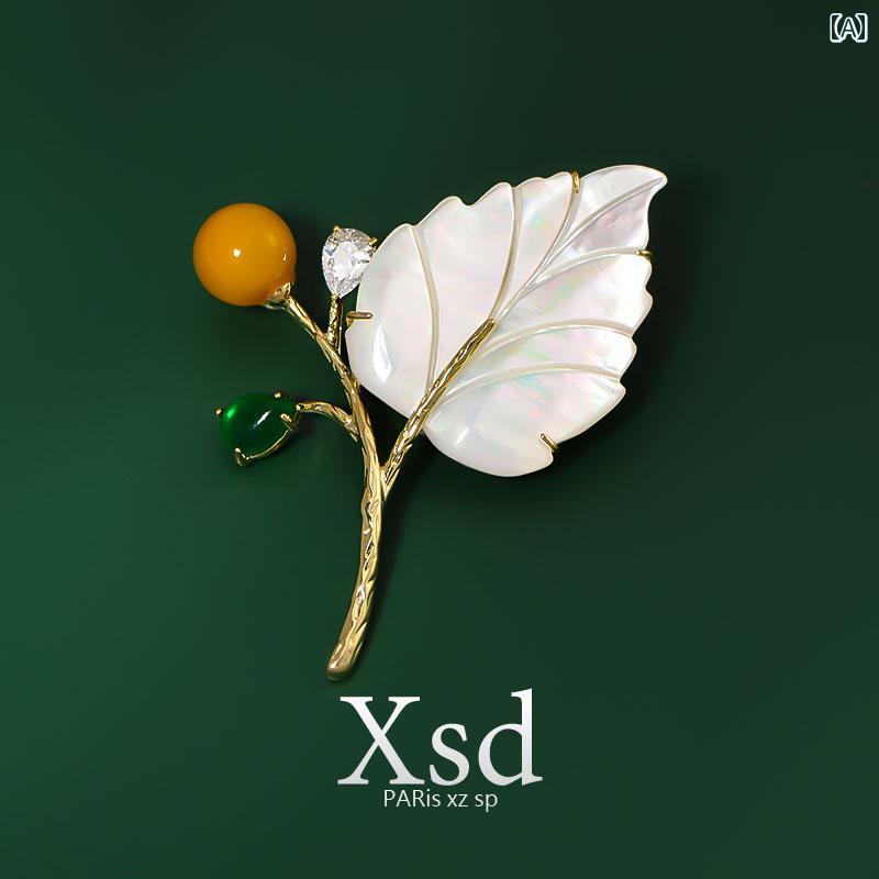 レディース アクセサリー ブローチ おしゃれ 大人かわいい 金色 枝 翡翠 葉 女性用 螺鈿 コサージュ 精巧 スーツ ピン
