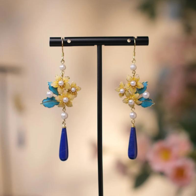 レディース イヤリング レトロ エナメル彩 花モチーフ パール ドロップ タッセル 点翠風 花丝 焼青 梨花 青金石風 伝統工芸 アクセサリー 女性用 耳飾り フラワー ジュエリー ビンテージ 装飾品 華やか 繊細 デザイン