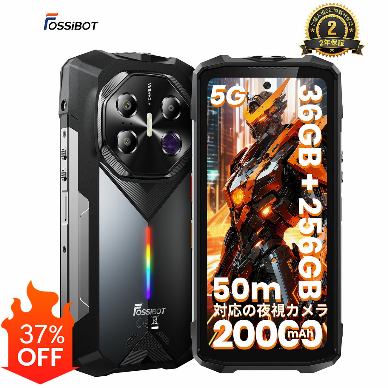メーカー希望小売価格はメーカーカタログに基づいて掲載しています 【商品情報】型番:FOSSiBOT F113 画面サイズ:6.78インチ バッテリー容量:20000mAh 対応OS:Android 15.0 接続方式:Bluetooth, Wi-Fi, USB, NFC サイズ:18.62 x 8.92 x 3.16 cm 重量:699.6g CPUスピード:2.6 GHz メモリ:36GBRAM+256GB ROM カメラ:64MP ナイトビジョンカメラ+50MP AI メインカメラ+64MP ナイトビジョンカメラ 解像度:1080*2460 防水防塵耐衝撃:IP68防水/IP69K 360°防塵/MIL-STD-810耐衝撃 対応周波数:GSM: B2/B3/B5/B8、WCDMA: B1/B2/B4/B5/B8、TDD: 34/38/39/40/41、FDD: 1/2/3/4/5/7/8/12/17/18/19/20/25/26/28A/28B/66、5G: N1/N3/N7/N8/N28/N38/N41/N77/N78。 その他の機能:USB OTG対応, 内蔵GPS, 急速充電サポート, 耐水性, 頑丈なボディ 保証期間:レビュー特典24ヶ月保証 【Dimensity 7050 5G プロセッサ|最大36GB RAM・256GB ROM/最大2TB拡張|Android 15】FOSSiBOT F113は、6nmプロセスの Dimensity 7050 5G プロセッサ を搭載し、高速演算と優れた省電力性を両立しています。日常の操作はもちろん、複数アプリの同時実行 や動画視聴、ゲームなどの高負荷シーンにもスムーズに対応します。最大36GB RAM(12GB 実装メモリ+24GB 仮想メモリ)により快適なマルチタスク環境を実現し、256GB ROMでは写真・動画・アプリを余裕をもって保存可能。さらに microSDカードにより最大2TBまで拡張できます。最新のAndroid 15を標準搭載し、直感的な操作性と高いセキュリティを両立。高性能を重視するユーザー向けの SIMフリー スマホ 本体 であり、タフネス設計による高い信頼性を備えています。 【64MP ナイトビジョンカメラ、最大50m撮影対応】 FOSSiBOT F113 は、全方位アップグレードされたカメラシステムを搭載した携帯電話で、さまざまなシーンで安定した高画質撮影が可能です。50MP AI メインカメラは PDAF 位相差オートフォーカスを備え、被写体を素早く正確に捉えます。HDR、パノラマ、スローモーションなどに対応し、さらに 4K 動画撮影も可能で、写真・動画のどちらも超高精細に記録できます。64MP ナイトビジョンカメラは最大 50m の長距離撮影を実現し、一般的なスマートフォン(約 10m)と比べて、夜間のアウトドア、防犯巡回、野生動物観察、緊急時や作業現場などの暗所でも被写体を鮮明に捉えることが可能です。3200 万画素のフロントカメラは自然な美顔撮影に対応し、5MP マクロカメラでは微細なディテールも手軽に撮影できます。また、FOSSiBOT F113 は android スマホ としても快適に操作でき、多様な撮影体験を提供します。 【20000mAh バッテリー|33W 急速充電|OTG リバース充電対応】FOSSiBOT F113 ゲーム用スマホ は、20000mAh の大容量バッテリーを搭載し、長時間の使用でも安心です。33W 急速充電に対応し、0〜80% まで約 2 時間 40 分で充電完了。さらに 18W リバース急速充電に対応し、スマートフォン、タブレット、Bluetooth ヘッドセットなどの小型デバイスへの充電も可能です。待受最大 2000 時間、通話最大 175 時間、ゲーム最大 40 時間、HD 動画最大 44 時間、音楽最大 95 時間、高輝度懐中電灯最大 38 時間、GPS 最大 32 時間と、さまざまなシーンで長時間活用できます。FOSSiBOT F113 は android 15 スマホ で、ゲームや動画視聴、外出先での作業など幅広く活用できます。 【6.78インチ FHD+ ディスプレイ|120Hz 高リフレッシュレート】FOSSiBOT F113 携帯電話 本体 シムフリー 新品 は、6.78インチの FHD+ ディスプレイを搭載し、120Hz の高リフレッシュレートで滑らかな画面表示を実現します。コーニングゴリラガラスを採用し、耐スクラッチ性能と高い耐久性を備えています。さらに高透過率と指紋防止加工により、明るくクリアな画質を維持しつつ、タッチ操作時の快適さも確保。高感度タッチ技術により、ゲームや動画再生、アプリ操作などもスムーズに行えます。解像度は 1080×2460、画素密度 396 PPI、峰値輝度 480cd(TYP) と、高画質コンテンツを存分に楽しめる性能を誇ります。FOSSiBOT F113 は アンドロイド スマホ としても操作性が高く、日常利用から高負荷ゲームまで幅広く活用できるモデルです。 【110dB スピーカー | 最大50m照射の高輝度ライト | AI アシスタント | ブリージングライト】FOSSiBOT F113は、日常使用からアウトドア活動まで幅広く活躍する5GスマホSIMフリー本体です。110dBのサウンドで、音楽や通話、動画視聴を迫力のある音で楽しめ、どんな環境でも快適に使用できます。さらに、最大50mの強光手電筒は160ルーメンの明るさで、夜間や暗所でもしっかり照明が可能。最大38時間の連続使用ができ、緊急時にはSOSモードも搭載されています。 FOSSiBOT F113は、あなたのオールインワン・インテリジェントパートナーとして、AIが日常のあらゆる瞬間をサポート。ブリージングライト機能では、通知や音楽に合わせて点灯し、視覚的にも楽しさを提供します。9種類のカスタマイズ可能なライトエフェクトで、通知や音楽の演出をおしゃれに演出します。 これらの機能を備えたFOSSiBOT F113は、スマートフォン本体SIMフリーとして、どんなシーンでも活躍する多機能なデバイスです。【防水・防塵・耐衝撃】FFOSSiBOT F1