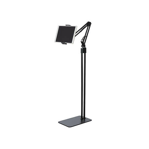 しっかりした台座に装着した支柱とアームによって、広い空間や部屋の中央でも高さを保持してスマートフォンやタブレットを使用できる床置式フレキシブルアームスタンド。しっかりした台座に装着した支柱とアームによって、広い空間や部屋の中央でも高さを保持してスマートフォンやタブレットを使用できる床置式フレキシブルアームスタンド。●広い空間や部屋の中央でも高さを保持してスマートフォンやタブレットを使用できる床置式フレキシブルアームスタンドです。 ●タブレットをしっかり固定し自在に位置調整できるため、リビングからベッドサイドまで様々な場所でお使いできます。 ●およそ5.0〜12.9インチのスマートフォン、タブレットに対応しています。 ●フレキシブルアームで、機器本体との距離や高さを好きな位置に調整して使用できます。 ●タブレットホルダーの接続部分にボールジョイントを採用しているので、角度や向きを自由に調節できます。 ●スタンド底面に装着している樹脂素材は、滑りにくく弾力性があり床面を傷つけません。 ●本製品の構造上、対応サイズでもバランスの悪い場合はスタンド状態を維持することができない場合がありますのでご了承ください。●材質:本体:ABS、ABS+熱可塑性エラストマー、スチール、EVA、ナイロン ●外形寸法:アーム部全長:約500mm、支柱部全長:約770mm、台座:幅約195mm×奥行き約325mm×高さ約26mm(支柱固定ネジ含む) ●重量:約3000g ●カラー:ブラック ●対応機種:5.0〜12.9inch(W221mm×D7mm×H306mmまで) ●耐荷重:約780g ●角度調節:○天然石(イエロータイガーアイ)1個おまけつき(商品とは関係ありません)別送