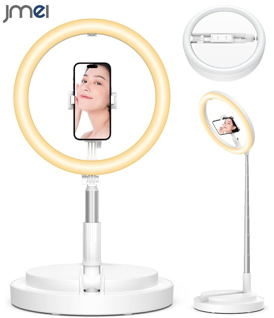 ⇒照明・撮影ライト 一覧はコチラ 【3色の照明モード・10段階調光】 LEDリングライトは、ウォーム、ミックス、ホワイトという3色の照明モードが搭載されていて、各照明モードは10段階の明るさ調節可能です。撮影状況や雰囲気に合わせて調整できます。リングライトの外径は11.4インチで、8インチや10インチのリングライトより、11.4インチの本製品は光量が大きくて、光の分布が均一になり、照明範囲も広くなります。リングライトの光によって顔の影やなくなり、見せたくない毛穴やシミ・シワなどが写らなくなり、肌をキレイに写せます。そして、10段階の調光機能が付いているので、それぞれのライトの色味も変更でき、光量を細かく調整できるので、様々の環境(雰囲気)によって、最適な照明モードを選択してご利用頂けます。 【高輝度LEDリングライト・美肌効果・安定感抜群】 外径11.4インチのリングライトは高輝度LEDビーズを120個搭載しているので、とても明るく、均一の安定した光出力があります!リングの内側にスマホを置いて使用することから、被写体全体に光が当たるため影ができにくく、表情が自然と明るくなります。オンライン会議やweb会議やテレワーク会議などのビジネスシーンで、好印象を与える効果もあります。そして、リングライトの底部は円盤のデザインで安定感も抜群です。底部にも滑り止めゴムが付き、擦り傷、転倒等のご心配はありません、市販の三脚スタンドリングライトより安定性と耐久性に優れています。 【自由に角度調整可能・8段階伸縮スタンド仕様】 リングライトは180°回転させることができます。搭載されているスマホスタンドも360°回転できるので縦写真でも横写真でもお好きな角度で撮影できます。また、このリングライトは8段階の伸縮スタンド仕様です。高さは52cmから168cmまで調節でき、撮影ライトとして顔から全身まで照明をあてることができます。卓上や地面両用でき、シーンに合わせて、誰でも楽にご使用頂けます。テーブルや台座などに置いて静物を撮ったり、テレワーク会議をしたり、床や地面に直接設置して生放送してもぴったりです。USB給電なので、場所を選ばず活用できる撮影照明ライトです。 【組み立てずに使用・収納便利】 普通の撮影照明ライトと比べると、本製品は三脚不要、雲台不要、組立て不要、折りたたみ一体式のリングライトです。組み立てずにサッとセッティングして使うことができます。別付けで使うパーツはない、収納後の幅も約29CMで、厚さは約6CMになり、コンパクトで使用し終わったら引出しに収納でき、持ち運びのも楽になります。 【USB給電式・様々なシーンで大活躍】 付属のUSB電源コードにリモコンを搭載しており、分かりやすいボタン操作で、リングライトの色や明るさを簡単に切り替えられます。デスクトップPC、モバイル電源、またはUSBソケットにいつでも接続できます。簡単で給電でき、家ではもちろん屋外でもいろいろ活躍しております。 ※商品は入荷時期によりアップグレードによる仕様変更がある場合がございます。予めご了承してください。 ※安価な酷似商品や転用画像商品にはくれぐれもご注意ください。 ⇒ホームプロジェクター 一覧はコチラ ⇒冷風扇・冷風機 一覧はコチラ ⇒スポットクーラー 一覧はコチラ ⇒キッズヘッドフォン 商品一覧はコチラ ⇒カラオケマイク 商品一覧はコチラ ⇒ポータブルDVDプレーヤー 一覧はコチラ ⇒車載スマホスタンド 一覧はコチラ ⇒モバイルモニター 一覧はコチラ ⇒ドライブレコーダー/ドライブオーディオ 一覧はコチラLEDリングライト 折りたたみ一体式 卓上地面両用 リングライト A-B09HCC1D1B 撮影用 自撮り用 配信用ライト 俯瞰撮影対応 11.4インチ 3色モード 10段階調光 卓上スタンド USB給電式 テレワーク/web会議/Youtubeビデオ/TIKTOK/自撮り/生放送/化粧/Zoom/美顔ライト/カメラ撮影に適用 日本語取扱説明書付