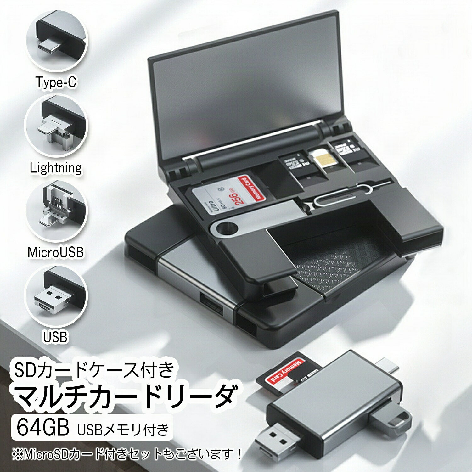 【スーパーセール★22%OFF販売中】マルチカードリーダー USBメモリ付き 64GB SDカードケース メモリケース Type-Cカードリーダー SDカードリーダー マイクロSDカードリーダー USBメモリ SDカード 32G 64G 128G Type-Aカードリーダー メディアケース SD microSD nanoSIM 薄型