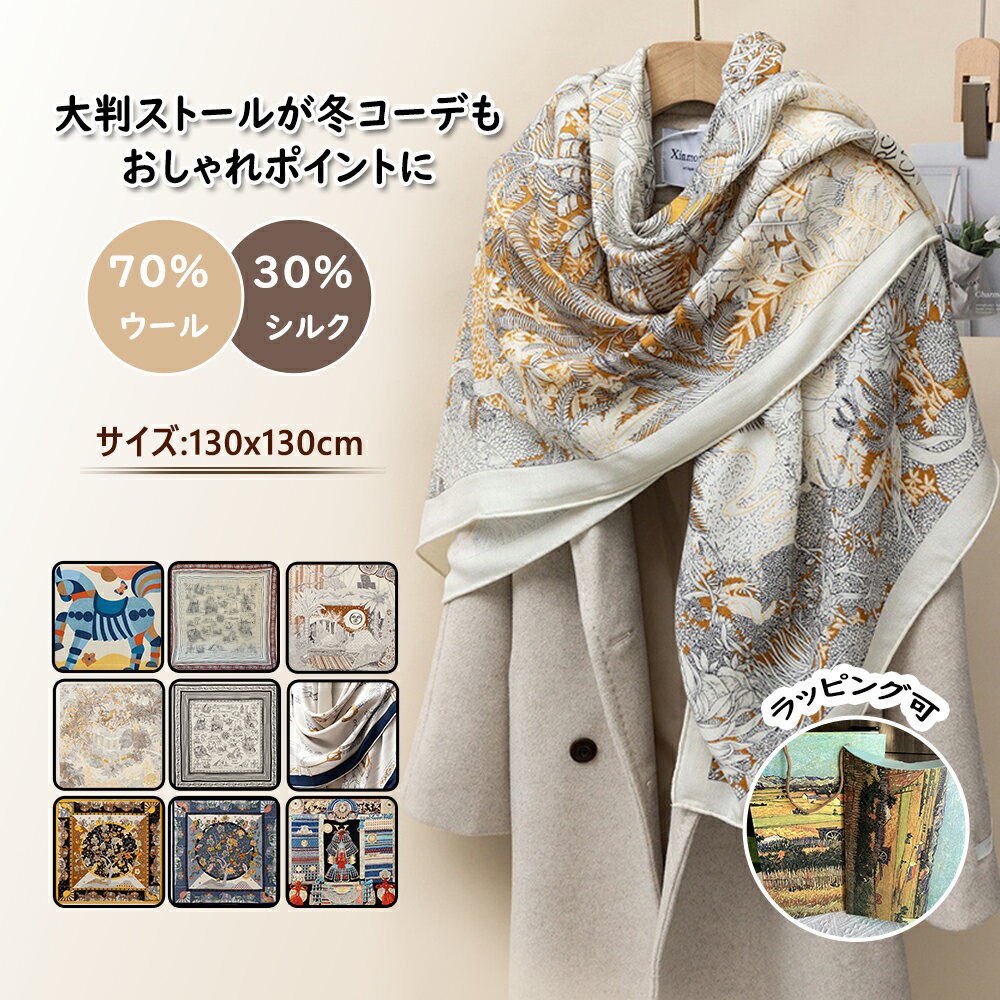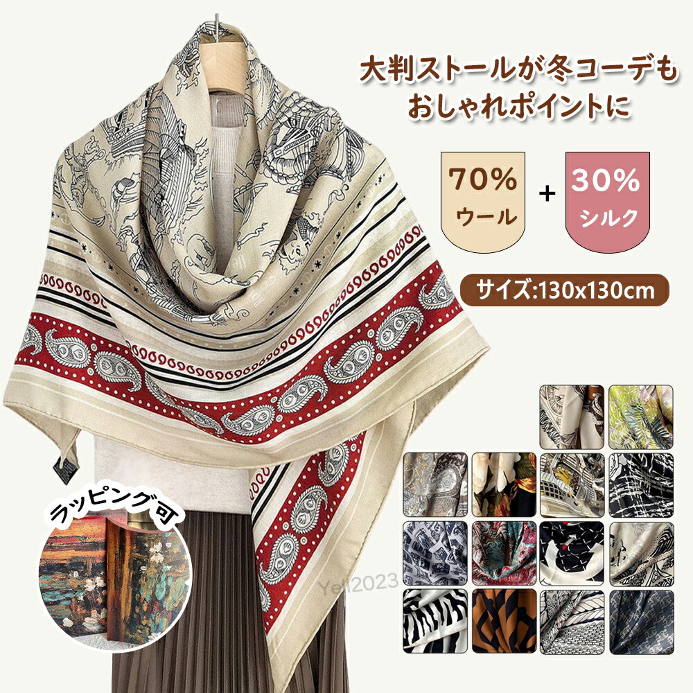 【マラソンクーポン利用で5980円】ストール レディース 大判 130×130 春夏秋冬 マフラー ウール シルク 大判スカーフ おしゃれ ペイズリ柄 バイカラー バンダナ柄 正方形ストール 上質 上品 高級 エレガント カシミヤ cashmere 母の日 敬老の日 ギフト 誕生日プレゼント