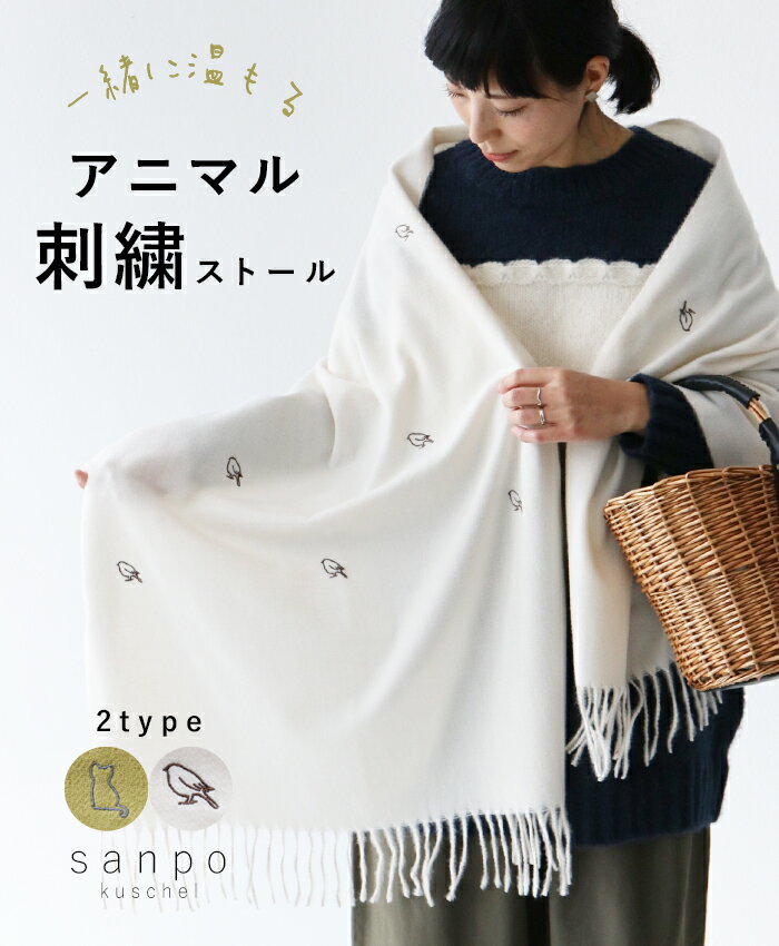 トップス【一緒に温もる アニマル刺繍ストール】アイボリー ピスタチオ マフラー ニット 暖かい 刺? 大判 動物 鳥 猫 レディース カジュアル かわいい 個性的 どこにもない ゆったり 30代 40代 50代 60代 sanpo【b13279ss】