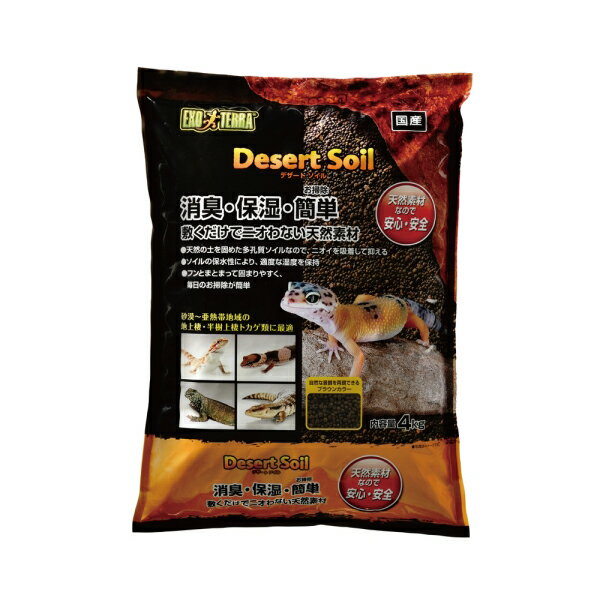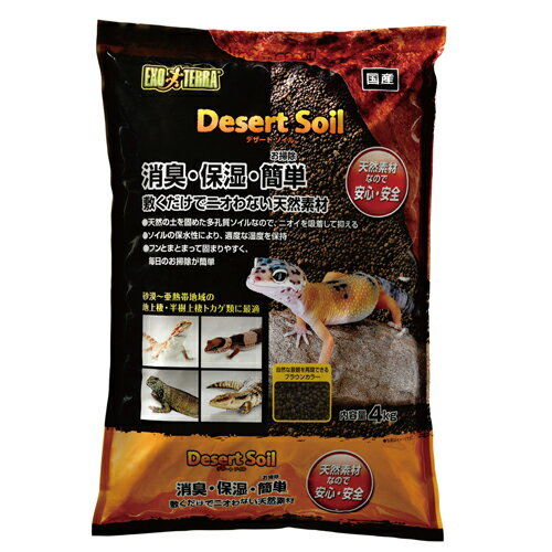 EXO TERRA デザートソイル 4kg 自然で快適なテラリウム環境を再現する床材・砂漠〜亜熱帯地域に棲息する、地表棲・半樹上棲トカゲ類に最適なケージ内のイヤな臭いを消臭する爬虫類飼育用ソイルです。・多孔質な状態で造粒しているソイルなので、排泄物の臭いを吸着し、ケージ内の臭いを抑えてくれます。・生息域では倒木や石の下など、やや湿った場所に生息しているので、水分値が高いソイルの性質を活かして、本来の生育環境を再現することができます。・自然な景観を再現しやすいブラウンカラー。【商品使用時サイズ】 幅280×奥行65×高さ370mm【材質 素材】天然赤土・飼育ケージの底に、約3〜5cm位の厚さになるように敷いてください。・適度にソイルを水で濡らすなどして、飼育環境を整えてください。ソイルは崩れやすいため、リクガメや大型のトカゲ類の飼育には適しません。生体の種類によって、床材の厚さや水の量が変わります。より詳しい飼育方法については、爬虫類専門店等の方にご相談ください。フン等の排泄物は毎日取り除くと、より良く飼育環境を維持できます。また、汚れが目立つところは、部分的に取り除いて新しいソイルと入れ換えることをおすすめします。排泄物などによるにおいを感じられたら、新しいソイルと入れ換えてください。種類や匹数、使用環境にもよりますが、約6か月ごとの交換が目安です。水洗いは不要です。【ご 注 意】※納品後の交換は、ご注文品番以外のものが届いた場合を除き、交換・返品などはお受けいたしかねます。※メーカー在庫の為お急ぎの場合は、納期の確認をお願い致します。通常1週間〜10日(土・日・祝日を除く)で発送となります。(土日祝日は定休日の為、発送営業日に含まれませんのでご了承下さい。) ◆当社指定運送会社 送料無料にて発送いたします。◆商品代引きご希望の場合、代引き手数料が別途必要となります。