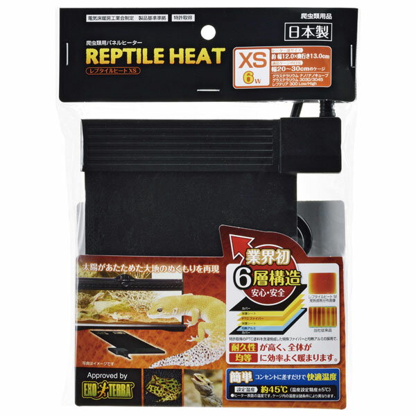 太陽があたためた大地のぬくもりを再現! 爬虫類用パネルヒーターです。 業界初 耐久性に優れ熱効率を高める安心安全の6層構造。 特許取得のPTC塗料を含浸燃成した特殊ファイバーと均熱アルミの採用で、抜群の耐久性と暖房効率の向上を実現しました。 本製品は住宅の床暖房として使用されている特殊ファイバー性のPTCを採用した自己温度制御式パネルヒーターです。 キズに強く高耐久を実現しました。 また均熱アルミの採用でヒーター全面が均一に暖まるので効率よくケージ内を暖めます。 急激な温度変化が生じにくいパネルヒーターは変温動物の爬虫類にとってやさしい暖房です。 [自己温度制御式(PTC)パネルヒーターとは] PTCとは温度が上昇すると抵抗が増え、電流を減少させる特性を持った物質のことです。 レプタイルヒートは、このPTC特性を持つ「特殊導電性塗料」を採用しました。 コンセントに差すだけで、ヒーター表面温度を一定(45度±5度)に保ち、爬虫類の快適温度を作ります。 ●使用方法簡単。コンセントに差すだけ。 ●コードの向きが気にならないリバーシブルタイプ採用で表裏どちら向きにも使用出来るのでコンセントに無理なく接続可能。 ●トラッキング防止プラグ使用 ●異常電流遮断機能(電流ヒューズ)採用 【定格電源】 AC100V 50/60Hz 【定格消費電力】 6W 【設定温度】 約45℃(温度設定精度±5℃) ※周囲温度約20℃、無風時でのヒーター本体表面温度 【使用可能周囲温度】 5〜40℃ 【製品サイズ】 約幅12.0x奥行き13.0cm(コード部除く) 【適応ケージの目安】 幅45〜60cm 【電源コード長】 約1.5m 【JANコード】 4972547029454 【原産国】 日本(MADE IN JAPAN) 【発売元】 ジェックス株式会社 ※ 同梱(1個口にまとめて)で発送できる商品については、出来る限り同梱で発送させていただきます。ただし、荷物が複数個になる場合は個数分の送料が必要になります。なお、水槽同士、及び水槽台、20kg以上の重量物は基本的に同梱での発送が出来ません。(30cmまでの水槽であれば2個まで同梱で発送可能です。) ※ 離島地域のお客様は、商品ご注文の前に送料をお尋ねください。