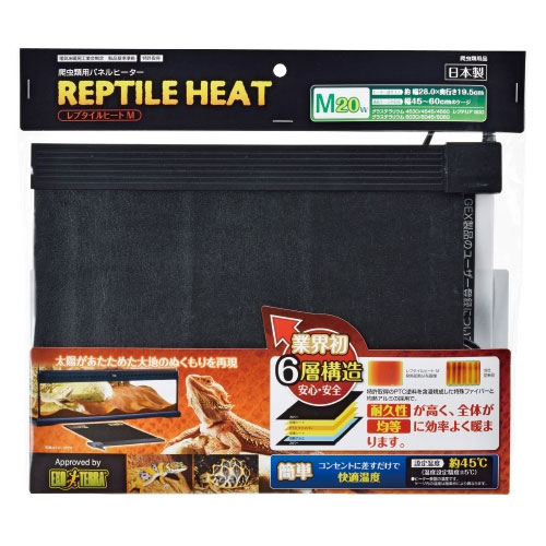 仕様 適応種:爬虫類 【ご使用方法】 幅45~60cmケージの補助ヒーターとして、ケージの下に敷いてご使用ください。 ガラスケージの下に敷いて、ケージとレプタイルヒートとの間に隙間をあけてご使用ください。 また、ケージの底面積1/3~1/2を目安に設置してください。 ※本製品には温度を下げる能力はありません 材質:[本体]PTC発熱体,PET,PP、[ケース]PP 製品サイズ(mm) 15×330×290 製品重量(g) 280 商品説明 太陽があたためた大地のぬくもりを再現。 業界初安心・安全の6層構造。 耐久性に優れ熱効率を高めます。 全体が均等に効率よく暖まります。 ※品質向上のため予告なく仕様を変更する場合がございます。パッケージのリニューアル等につき、商品画像が異なる場合がございます。商品画像の色合いは、画像処理上、若干異なる場合がございます。