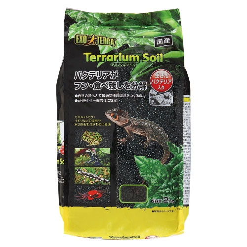 サイズ:4キログラム (x 1)◆商品名:ジェックス EXO TERRA (エキゾテラ) テラリウムソイル 4kg 爬虫類・両生類用多孔質ソイル pH中性~弱酸性 ニオイ吸着 砂漠・亜熱帯環境 天然素材本体サイズ(幅X奥行X高さ):26.5×7×38.5cm本体重量:4000g原産国:日本生きたバクテリアがフンや食べ残しなどの有機物をスピード分解。自然の浄化力で適切な生息環境を作る床材。カエル・トカゲ・イモリなどの湿度や水辺を好む生き物に。商品紹介 生きたバクテリアがフンや食べ残しなどの有機物をスピード分解! 自然の浄化力で最適な生息環境を作る床材! カエル・トカゲ・イモリなどの湿度や水辺を好む生き物に最適! ・自然の土壌にも生息する、生きたバクテリア(バチルス菌)をソイルに配合。放置すると水や土壌の有害物質となるフンや食べ残しの餌などを分解するので、生体にとって負担の少ない環境が続きます。 ・多くの爬虫類・両生類に適している中性~弱酸性にpHを安定 ・水草の栄養剤等は含んでいないので、生体に安心! ・疎水性、通水性、保水性に優れているので、植物と一緒にレイアウトを楽しむ、テラリウムにも最適で植物育成にも適しています。 ・粒サイズ2~4mm ・生体の色が映える黒色 ・湿度や水辺を好む爬虫類・両生類や、カニ等の甲殻類など、様々な生体に使用可! ・水洗いは不要です。 使用上の注意 ※水洗いは不要です。ソイルは崩れやすいため、セットの時は緩衝材を使用して水を静かにいれて、かき混ぜないようにしてください。水を勢いよく入れるとニゴリが発生します。※セット時にニゴリが発生した場合でも数時間でニゴリが軽減されます。フィルターを併用すると、水のニゴリを早く取り除くことが出来ます。万一、ニゴリが消えにくい場合でも生体に影響はありません。※天然素材100%で製造したソイルなので、強い力をかけると粒が崩れる性質があります。メンテナンスの際は、できるだけ丁寧に取扱い、かき混ぜたり押したりして圧力をかけないようにしてください。※粒がすぐ崩れる場合があるので、大型で体重が重く、土を掘り返す修正のある生体には適しません。※各種フィルター器具を使用する際は吸い込み口からソイルが入らないように離してご使用ください。また、吐出口に岩、流木を置き、水流が直接ソイルにあたってソイルを巻き上げないように工夫をしてください。※海水・汽水や、硬度が高く、アルカリ性の水質を好む生体には適していません。 原材料・成分 天然黒ボク土、活性炭、バチルス菌 使用方法 ・飼育ケージの底に、約3~5cmくらいの厚さになるように敷いてください。 ・必要に応じて、ソイルを水で濡らしたり、水をはったりして、飼育環境を整えてください。(水をはらなくても使用できます) ※製品の仕様、デザイン、価格等予告なく変更することがあります。