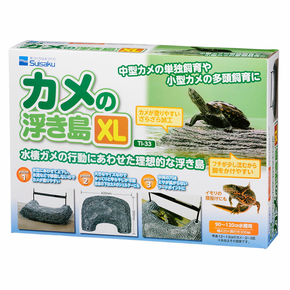 水棲ガメの行動にあわせた理想的な浮き島です。 中型カメの単独飼育や小型カメの多頭飼育にどうぞ 水棲のカメは陸地での甲羅干しが欠かせません。甲羅干しをすることによって、皮膚病の予防や成長に欠かせないカルシウムの吸収を補助するビタミンD3を合成します。 【特長】 ●フロートタイプなので水位に合わせて浮き島が上下します。フロートガイドで固定されるので水流などにより本体が流されることがありません。 ●カメが登りやすいように本体のヘリの部分が常に沈んでいる新設設計です。 ●本体表面をざらざらに加工し、カメのツメが引っ掛りやすくなっています。 ●本体中央のくぼみに給餌することによりエサのまき散らしを防止します。 ●大きめのサイズなので複数のカメ飼育にも最適です。浮き島の下はカメが落ち着くシェルターにもなります。 【適合水槽】 90〜120cm水槽 【適合匹数】 甲長12〜13cmのカメ・・・2〜3匹 【本体サイズ】 幅420x奥行き300mm 【JANコード】 4974105030339 【発売元】 水作株式会社 ※ 同梱(1個口にまとめて)で発送できる商品については、出来る限り同梱で発送させていただきます。ただし、荷物が複数個になる場合は個数分の送料が必要になります。なお、水槽同士、及び水槽台、20kg以上の重量物は基本的に同梱での発送が出来ません。(30cmまでの水槽であれば2個まで同梱で発送可能です。) ※ 離島地域のお客様は、商品ご注文の前に送料をお尋ねください。