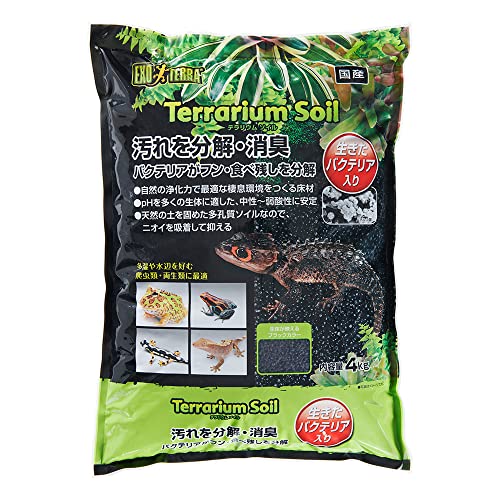 無し/4キログラム (x 1)/-・Size:4キログラム (x 1)・パッケージ個数:1・本体サイズ(幅X奥行X高さ):26.5×7×38.5cm・本体重量:4000g・原産国:日本・生きたバクテリアがフンや食べ残しなどの有機物をスピード分解。・自然の浄化力で適切な生息環境を作る床材。商品紹介 生きたバクテリアがフンや食べ残しなどの有機物をスピード分解! 自然の浄化力で最適な生息環境を作る床材! カエル・トカゲ・イモリなどの湿度や水辺を好む生き物に最適! ・自然の土壌にも生息する、生きたバクテリア(バチルス菌)をソイルに配合。放置すると水や土壌の有害物質となるフンや食べ残しの餌などを分解するので、生体にとって負担の少ない環境が続きます。 ・多くの爬虫類・両生類に適している中性~弱酸性にpHを安定 ・水草の栄養剤等は含んでいないので、生体に安心! ・疎水性、通水性、保水性に優れているので、植物と一緒にレイアウトを楽しむ、テラリウムにも最適で植物育成にも適しています。 ・粒サイズ2~4mm ・生体の色が映える黒色 ・湿度や水辺を好む爬虫類・両生類や、カニ等の甲殻類など、様々な生体に使用可! ・水洗いは不要です。 使用上の注意 ※水洗いは不要です。ソイルは崩れやすいため、セットの時は緩衝材を使用して水を静かにいれて、かき混ぜないようにしてください。水を勢いよく入れるとニゴリが発生します。※セット時にニゴリが発生した場合でも数時間でニゴリが軽減されます。フィルターを併用すると、水のニゴリを早く取り除くことが出来ます。万一、ニゴリが消えにくい場合でも生体に影響はありません。※天然素材100%で製造したソイルなので、強い力をかけると粒が崩れる性質があります。メンテナンスの際は、できるだけ丁寧に取扱い、かき混ぜたり押したりして圧力をかけないようにしてください。※粒がすぐ崩れる場合があるので、大型で体重が重く、土を掘り返す修正のある生体には適しません。※各種フィルター器具を使用する際は吸い込み口からソイルが入らないように離してご使用ください。また、吐出口に岩、流木を置き、水流が直接ソイルにあたってソイルを巻き上げないように工夫をしてください。※海水・汽水や、硬度が高く、アルカリ性の水質を好む生体には適していません。 原材料・成分 天然黒ボク土、活性炭、バチルス菌 使用方法 ・飼育ケージの底に、約3~5cmくらいの厚さになるように敷いてください。 ・必要に応じて、ソイルを水で濡らしたり、水をはったりして、飼育環境を整えてください。(水をはらなくても使用できます) ご注意(免責)>必ずお読みください ※製品の仕様、デザイン、価格等予告なく変更することがあります。
