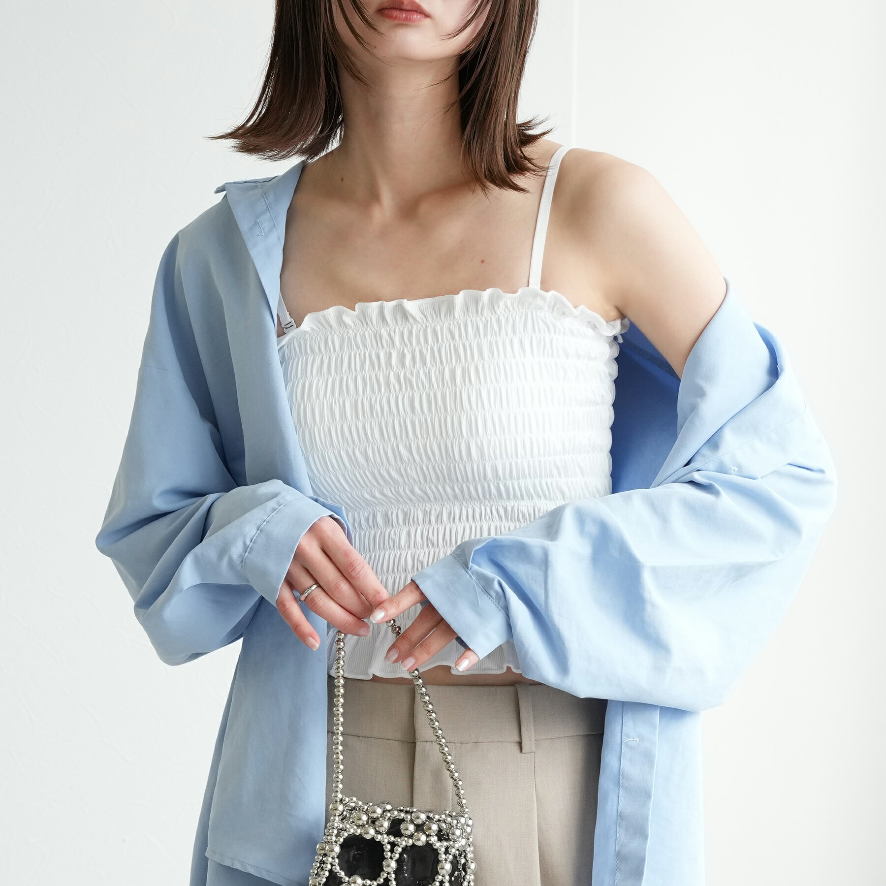 【カップ付き シャーリングフリルキャミソール】 ブラトップ 5色 ストラップ取り外し可能 ビスチェ ブラキャミ トップス ブラック ホワイト 黒 白 ダークグレー グリーン ピンク シャツやシースルートップスのインナーに 1枚までメール便送料無料