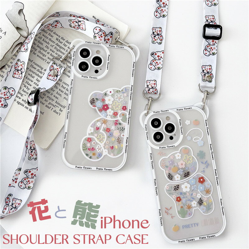 iPhone 15 14 13 12 16 pro max ショルダー タイプ スマホケース iPhone 16 15Pro MAX 携帯ケース アイフォン 12 13 11 15 ショルダーストラップ 付き iphoneケース 韓国 肩掛け 斜めかけ 子供用 耐衝撃 透明 クリア TPU iPhone14 plus 薄型 カバー かわいい クマ 熊 花柄