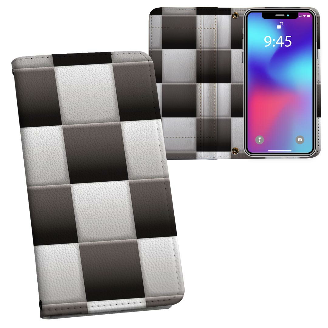 iPhone17 用 内側プリント ケース カバー 手帳型 マグネット式 ピタッと閉まる レザーケース カード収納 ポケット 003737 チェック 白 黒