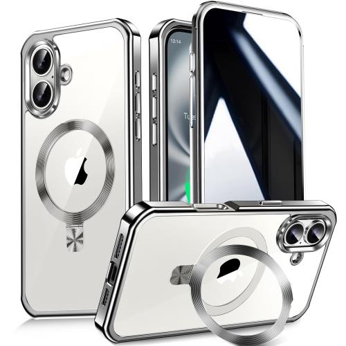 多機能隠しスタンド・マグセーフ対応・覗き見防止WTAIYUN iPhone 16 用 ケース 全面保護 CDリング 縦横両対応 ワイヤレス充電対応 米軍MIL規格 耐衝撃 高感度タッチ 両面 いphone16 カバー ストラップホール付き メッキバンパー PC背面 透明 黄変防止 アイフォン16 ケース 6.