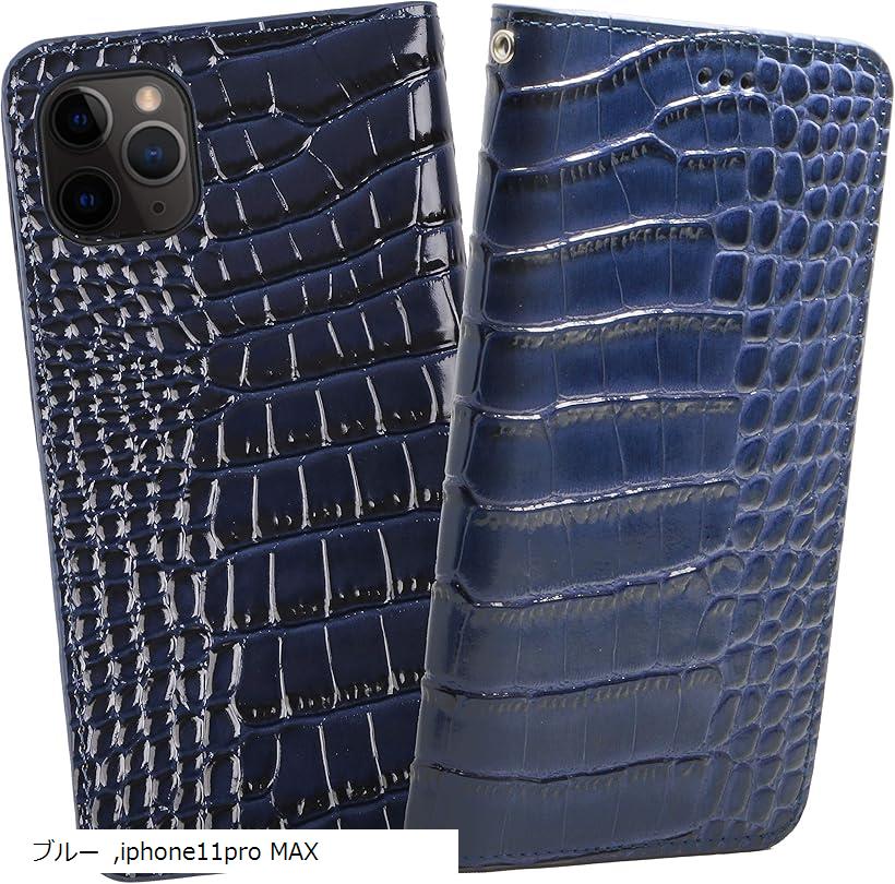 クロコダイル x 牛革 iPhone11 Pro Max apple . 手帳型 レザー ケース 11proMax ブルー (ブルー, iphone11pro MAX)