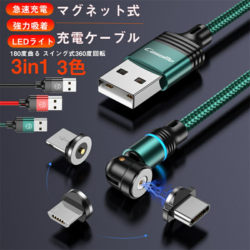 3in1 iPhone 15 マグネット充電ケーブル スイング式 急速充電 強力吸着 LEDライト Type-C Micro-USB Lightning スマートフォン タブレット iPhone iPad Android マグネット式 充電 ケーブル 充電コード 防塵 USB充電ケーブル 磁気 磁石端子 180度曲る 360度回転 マグネット