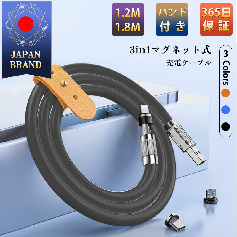 3in1マグネットケーブル 540度回転 iPhone 充電ケーブル 3種類コネクタ付 アイフォンケーブル 亜鉛合金プラグ 急速充電 データ転送 シリコン Type-C iPhone充電コード lightning 充電器 365日安心保証 RYECHER