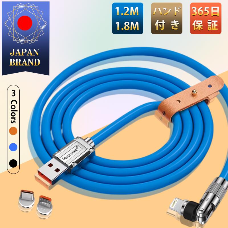 商品情報特徴【急速充電対応】ケーブルは最大出力12WのQC高速充電をサポートし、接続デバイスへの急速充電を実現します。スマートフォンやタブレット端末はもちろん、ノートパソコンの充電も可能です。急速充電には対応したACアダプターを併用してください。また、最大480Mbpsの高速データ転送が可能です。映画、ファイル、曲などを素早く転送し、大容量のファイル・写真を数秒で転送できます、時間が大幅に節約できます。 【かつてない柔軟性】環境に優しい液体シリコン素材を採用し、従来のケーブルにはないやわらかさを実現し、肌に柔らかく爽やかな手触りを与えます。ほこり・汚れ・指紋に強いです。 【優れた耐久性】プラグの保護シェルは亜鉛合金製で、酸化や腐食、摩耗に強く、耐久性に優れています。また、ケーブルは約20000回以上の曲げに耐える優れた耐久性を実現し、ケーブル内部の断線を防ぎ、安心して充電できます。【好みに合わせたカラーバリエーション】(全3色2種類の長さ)スマートフォン本体やケースの色に合わせたり、自分好みの色を選びやすいカラー展開。 バッグや小物と合わせてコーディネートすることも出来ます。【対応機種】iphone(アイフォン)、iPadなどのあらゆるデバイスへ対応しております。【製品仕様】 品名:シリコン充電ケーブル 端子:Type-C / lightning / Micro usb 出力:5V/2A 5V/2.4A 長さ:1.2m / 1.8m カラー:オレンジ、ブラック、ブルー 素材:シリコン+純銅ワイヤ+亜鉛合金【注意事項】 ※一部のデバイスの仕様(Pixel-Type-C端子)によっては対応できない場合があります。 ※お客様のモニター環境より、色などが実際の商品と若干異なる場合がございます。2