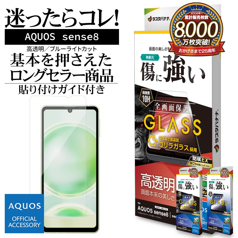 AQUOS sense8 SH-M26 SH-54D SHG11 sense7 SH-53C SHG10 ガラスフィルム 全面保護 高光沢 ブルーライトカット ゴリラガラス採用 ホコリ防止 0.33mm 硬度10H 貼り付けガイド アクオス センス 保護フィルム ラスタバナナ