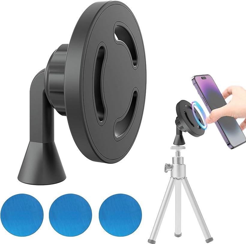 スマホホルダー 三脚アダプター 強力 マグネット 脱着簡単 360度回転 1/4インチネジ穴 プレート3枚付 自撮り棒 (ブラック)