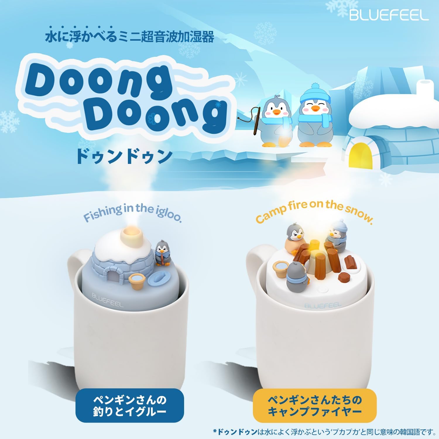 【テレビ めざまし 紹介】 BLUEFEEL公式 卓上加湿器 DoongDoong 浮かべる ミニ加湿器 キャンプファイヤー 釣りとイグルー 超音波加湿器 コードレス加湿器 卓上加湿器 小型加湿器 可愛い加湿器 タンクレス コップ キャラクター コンパクト 寝室 オフィス 乾燥対策 連続噴霧 最新のユニーク卓上加湿器、タンクレス設計のため、コップの水で加湿するので、お手入れも簡単で衛生的です。かわいいペンギンデザインで、癒しと快適な空間を演出する卓上加湿器 水に浮かべて加湿 タンクレス設計♪ パッケージ構成・加湿器本体 ×1・取替用コットンフィルター ×1・USB-A to C ケーブル ×1・取扱説明書および保証書 ×1製品仕様【キャンプファイヤー】寸法:72 × 72 × 74mm重量:119g【釣りとイグルー】寸法:72 × 72 × 76.6mm重量:119g消費電力: 2Wバッテリー容量:800mAh電圧/電流: DC 5V/1A充電端子: USB-C噴霧量: 40ml/h噴霧可能範囲: 20m2 水に浮かべて加湿 タンクレス設計 選べる2色のムードライト USB充電式のコードレス設計 【在庫がある場合】1営業日以内に発送いたします。1