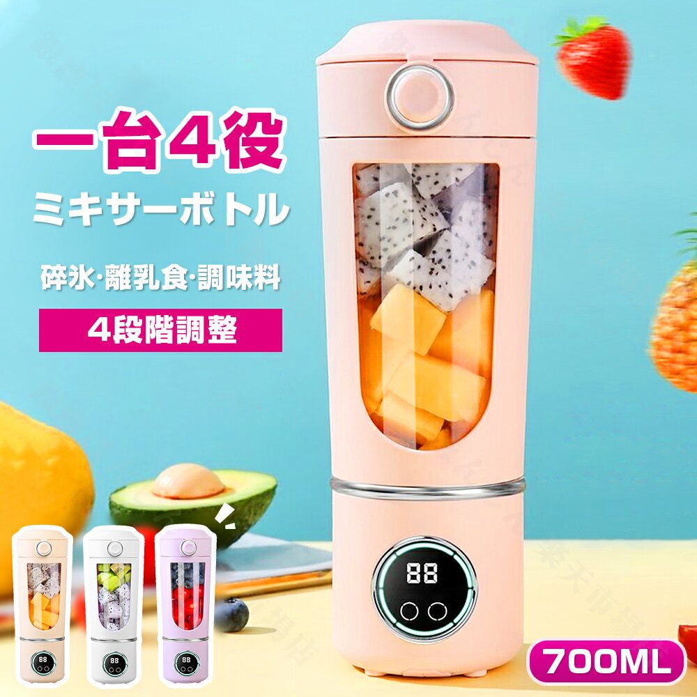 ジューサー ミキサーボトル 1台4役 コードレス コーヒーミル 氷も砕ける 700ml 丸洗い可 コンパクト USBジューサー 携帯ジューサー ハンドミキサー 小型 洗いやすい USB充電式 持ち運び便利 携帯コップ アウトドア 旅行 安心保証 送料無料