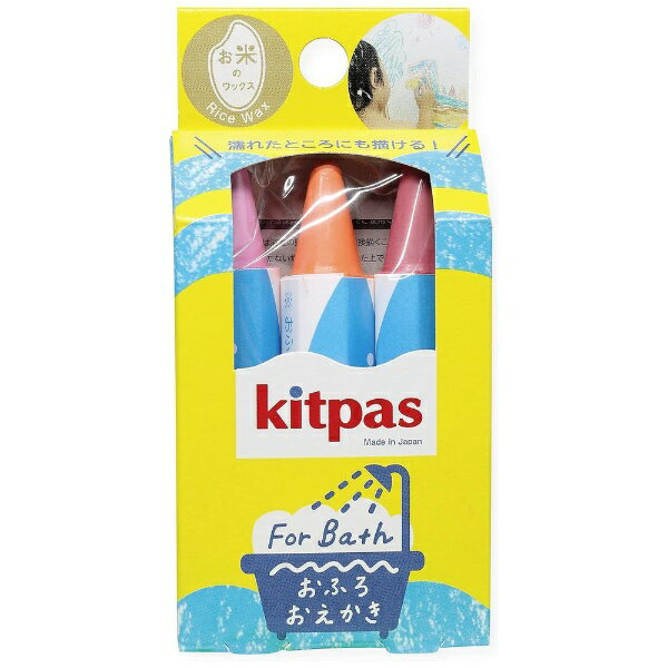 おふろ用キットパス3本の原料が“ライスワックス”に。よりやさしくなりました。「ライスワックスって?」ワックスはキットパスを固めて形を保つ大切な役割があります。私たちが食べる白米を、玄米から精米する際に削られるぬか層から抽出したのがライスワックスです。・有害物質の玩具基準に適合(ST基準第3部準拠)・濡れた面にも鮮明になめらかに描ける・水を含ませたスポンジで消せる・湯船に落としても浮いて溶けにくいキットパス・紙巻は濡れても破れにくい耐水紙、おさかなの柄で楽しい。・持ちやすく転がりにくい六角形セット内容おふろ用キットパス3本材質キットパス:ライスワックス、顔料、その他◆使い方1、キットパスを使って自由にお絵かきを楽しめます。 先が短くなったら巻紙の下の部分を押して、中身を押し出すようにしてください。2、描いた絵や文字は、水に含ませたスポンジで消した後また書くことができます。3、風呂上りにはキットパスは必ず消して、水滴をふき取ってください。 (色が残ったままにしておくと消えなくなることがあります。)ご注意(本品使用の際は保護者の監督の下でご使用ください)おふろ用キットパスはおえかきボード以外にも浴室の壁や浴槽などに直接描くこともできますが、使用前には必ず目立たない場所で消えるか試した上でお楽しみください。1.描いたものはお風呂上りにキレイに消す。色が残ったままにしておくと消えなくなる恐れがあります。お風呂上りにキットパスで描いたものは必ず色をキレイに消し、水滴を拭き取って下さい。床に流れ落ちた色も水、又はお湯でキレイに流して下さい。2.消えない材質がありますので必ず試してから使用。キットパスは木質、タイルの目地、ユニットバスなど描くと消えない素材があります。必ず目立たないところでお試しの上、消えることを確認してからご使用ください。※誤って消えない材質に書いて残ってしまった場合の処置お風呂専用洗剤や塩素系漂白剤で浸してから拭き取ってみてください。その際、洗剤の使用方法に基づいてお使いください。この方法でも完全に消えない場合、施工された建築業者又はお風呂メーカーに消去の方法をお聞きになるか、又は消去をご依頼ください。3.誤飲誤食、目に入れないこと窒息の恐れがあるため、本品を口に入れないようにしてください。目に入った時はすぐに洗い流してください。また、お肌に異常が見られた時はすぐに使用を中止し、異常が残る場合は医師にご相談ください。
