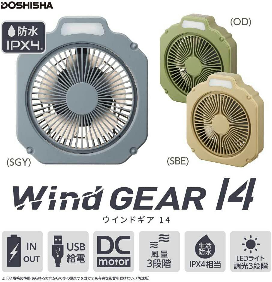 ポータブル 扇風機 Wind GEAR(ウインドギア)LEDライト付 防水機能 (IPX4) 2電源対応(充電式・USB電源)14cm 簡単設置 屋外 アウトドア キャンプ BBQ リゾート レジャー ビーチ 省スペース コンパクト FBX-141B