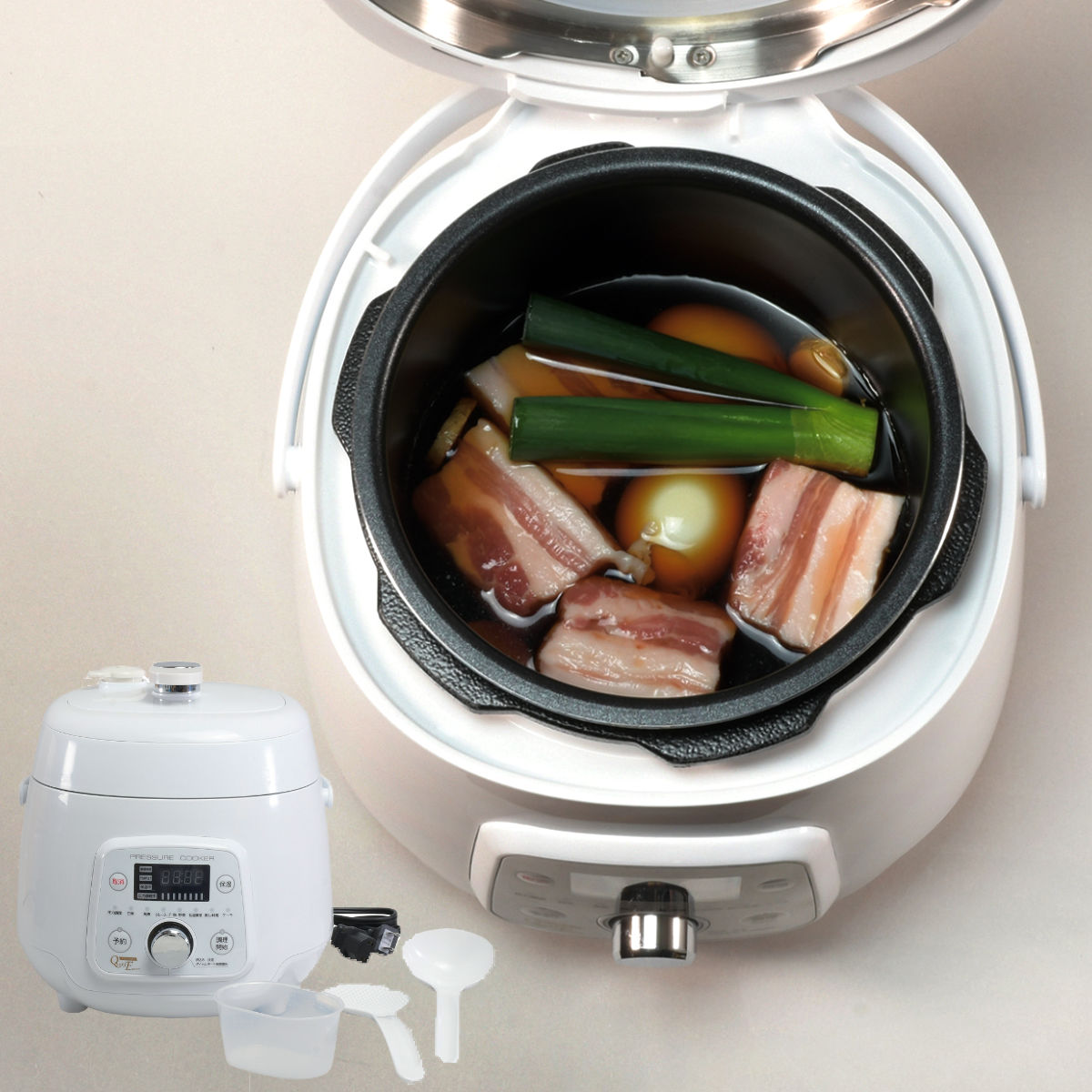 サイズ約 幅24×奥行28×高さ25(cm)重量約 2960g容量約 1.6L満水容量:2.5L4合炊き内容量1個付属品:軽量カップ、しゃもじ、おたま材質本体・軽量カップ・しゃもじ・おたま:ポリプロピレン内がま:アルミニウム合金(ふっ素樹脂塗膜加工)生産国中国製消費電力600Wコードの長さ1(m)備考最高圧力:50kPa電源:AC100V 50/60Hz区分返品・キャンセル区分(小型商品)ギフトラッピングページを見る●材料を入れてボタンを押すだけで、本格的な料理ができあがる電気圧力鍋です。●自動で調理が行われるので、調理中は他の家事や自分の時間にあてることができます。●ダイヤル式なので操作が簡単です。●予約機能を使えば、毎日できたてが楽しめます。●調理後は最大12時間、自動保温されます。おすすめポイントほったらかしで、本格料理がぐっと身近にレシピ通りに材料を入れてボタンを押すだけで、簡単ほったらかし調理ができます。ほろほろとろける肉料理や骨までやわらかい魚料理など、時間のかかるメニューも短時間でおいしく調理できます。火を使わず自動で調理が進むため、キッチンに張り付いて見守る必要がありません。調理中はほかの家事をしたり、自分の時間を楽しんだりと、暮らしにゆとりを生み出します。商品詳細シンプルでコンパクトな設計一般的な電気圧力鍋よりも比較的コンパクトなサイズです。ダイヤル式なので、何度もボタンを押す必要がなく、簡単にコースや時間などを設定できます。予約機能で毎日できたてが楽しめる予約タイマー機能が搭載されており、最大24時間まで予約可能です。お出かけ前に帰宅時間に合わせてタイマーをかけておけば、帰宅する頃にはおいしい料理ができあがります。調理後は最大12時間、自動保温されるので、帰宅が遅くなっても安心です。多彩な本格料理のレシピ付き豚の角煮・魚の煮付け・カレー・蒸し料理など、メイン料理からデザートまで、自動で調理できるレシピが付いています。関連キーワード:圧力なべ 家電 電気調理器 電気式圧力鍋 電気鍋 電気なべ 鍋 なべ 簡単 便利 役立つ 料理 調理 時短 手軽 時短料理 時短調理 つくりおき 作り置き キッチン小物 キッチン雑貨 キッチン用品 キッチンアイテム 調理器具 おすすめ オススメ 関連商品はこちら電気圧力鍋 3L ERETTO mono レシ12,880円D&S 家庭用マイコン電気圧力鍋 2.5L レ17,600円電気圧力鍋 8L 楽ポンプロ 業務用 マイコン42,980円電気圧力鍋 4L マイコン 楽ポン ヌージュ 18,280円電気圧力鍋 3L マイコン 楽ポン ヌージュ 16,280円象印 自動調理鍋 ホーロー電気調理鍋 65,780円 圧力鍋 5.5L IH対応 魔法のクイック料16,280円電子レンジ圧力鍋 2.3L プラスチック製 極5,980円テーブルフライヤー 家庭用 電気フライヤー ピ14,080円圧力鍋 4L IH対応 20cm 圧力切替 エ12,800円電気炊飯器 5合炊き 糖質33%OFF炊飯器 12,980円電気式 卓上 串揚げ鍋 天ぷら鍋 自動油温調節5,480円