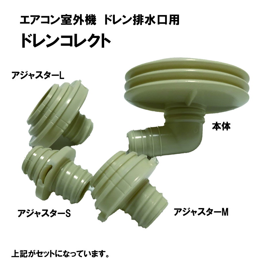 エアコン室外機のドレン排水穴から直接排水ができない場合にドレンホースで延長して引き回しが可能です。 エアコン各社の室外機に対応するアジャスター3種付