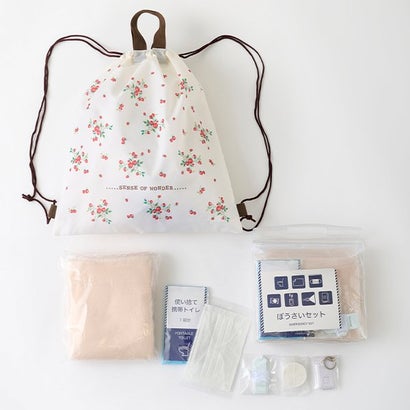 災害時に持っていると役立つ防災セットです。携帯トイレ、ブランケット、マスク、圧縮タオル、ホイッスル、ソーラーライト、防災のしおりの7点セット。ナップサックつきなので、両手が空いた状態で持ち運びできます。ナップサックは繊細なイチゴが魅力の総柄デザインです。【製品寸法】サイズ:対象×本体(W×H×D)×ナップサック:H×WF:ベビー×20×19×5.5×37.5×35【素材】ナップサック:ポリエステル【モデル】【サイズ】サイズ:対象×本体(W×H×D)×ナップサック:H×WF:ベビー×20×19×5.5×37.5×35