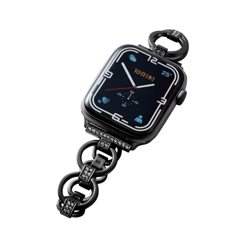 エレコム Apple Watch Series 7 [45mm]、SE、6、5、4 [44mm]、3、2、1 [42mm] バンド ステンレス チェーンタイプ ラインストーン ブラック AW-45BDSSJBK ゴールド輪がつながっているようなデザインにラインストーンをあしらったApple Watch Series 7 [45mm]、Apple Watch SE、Series 6、5、4 [44mm]、Apple Watch Series 3、2、1 [42mm]用ステンレスチェーンバンドです。バンドの各部分にラインストーンを埋めこみ、ブラックのステンレスが、手首をラグジュアリーに彩ります。細身のチェーンでブレスレットのようなエレガントさがあり、結婚式やパーティなどのフォーマルシーンにも使えます。ステンレスバンドは水や汗に強く長い年月で使用することができます。Apple Watch本体カラーとマッチする、ブラックです。