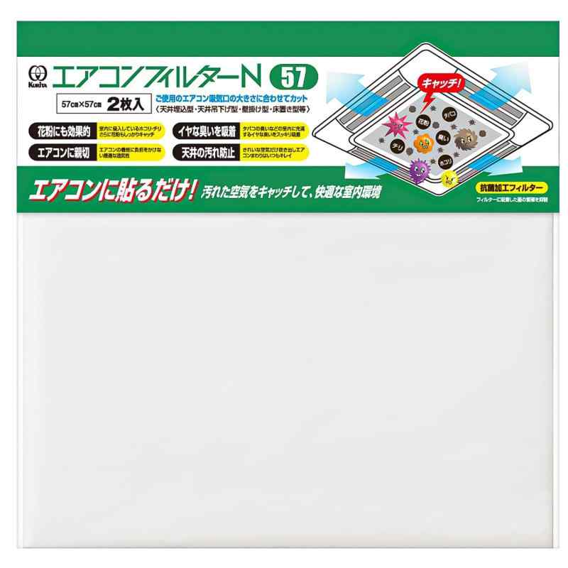 クリタック(Kita) 業務用エアコンフィルター N57 2枚入り 日本製 AICF-5072エアコンに貼るだけ空気中の「ヨゴレ」をキャッチして室内環境を快適にしてくれるエアコンフィルター。[サイズ]約57×57cm(1枚当たり)[重量]約40g(1枚当たり)[交換時期の目安]約4週間(エアコンの使用環境などにより異なります。使用期間の目安にかかわらず、フィルターが汚れてだんだん黒くなり模様がはっきり浮き出てきたら交換のサインです。)