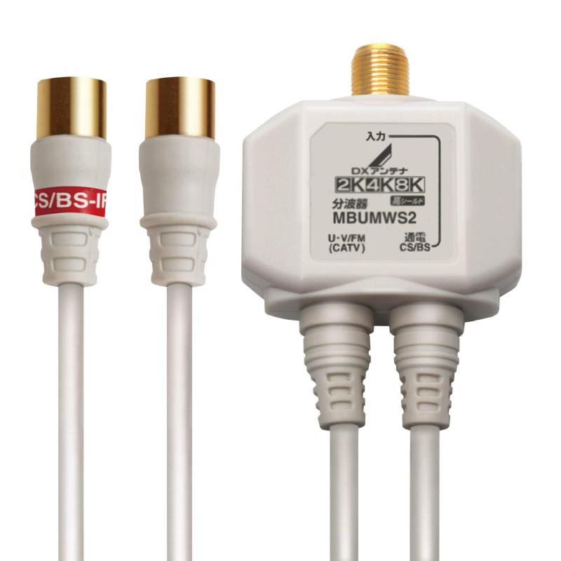 DXアンテナ 分波器 【2K 4K 8K 対応】 BS/CS-IF出力 入力端子間通電 ノイズに強い出力ケーブル一体型 0.2m MBUMWS2(B)既存の2K放送から4K・8K(3224MHz)放送まで対応した製品です。テレビに、地デジとCS・BS電波を接続する時に使う分波器です。ノイズに強い出力ケーブル付。出力はネジ式のF型プラグを採用。プラグ部分は金メッキで接触不良を防ぎます。衛星放送は4K8K(~3224MHz)に対応。従来の2K放送のテレビでも使用できます。入力F形接栓。出力側 ストレートプラグ付2Cケーブル 0.2m。衛星放送側は通電仕様。出力ケーブルは3重シールド低損失極細ケーブルを使用、外部からの雑音を排除します。