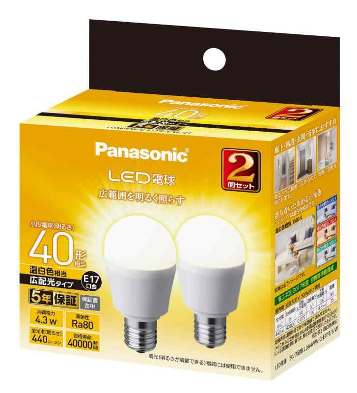 パナソニック ミニクリプトン型 LED電球 口金直径17mm 電球40W形相当 温白色相当(4.3W) 一般電球・広配光タイプ 2個入り 断熱材施工器具 密閉形器具対応 LDA4WWGE17ESW2T